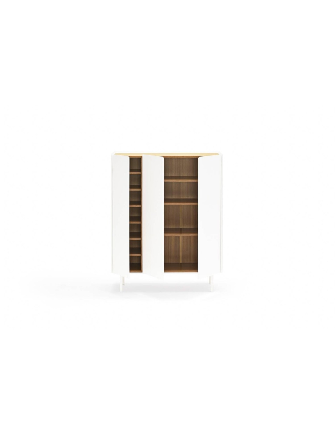 Mueble auxiliar Arista de diseño moderno minimalista. La tapa del mueble está chapada en roble natural, mientras que el casco es DM lacado en colores BLANCO, NEGRO, VERDE, BURDEOS. El interior está realizado en laminado con acabado de roble, con botellero y cuatro baldas a distintos niveles para ofrecer un espacio de almacenaje completo y versátil.Consta de 3 puertas con bisagras de amortiguación,lo que asegura un cierre suave y silencioso.