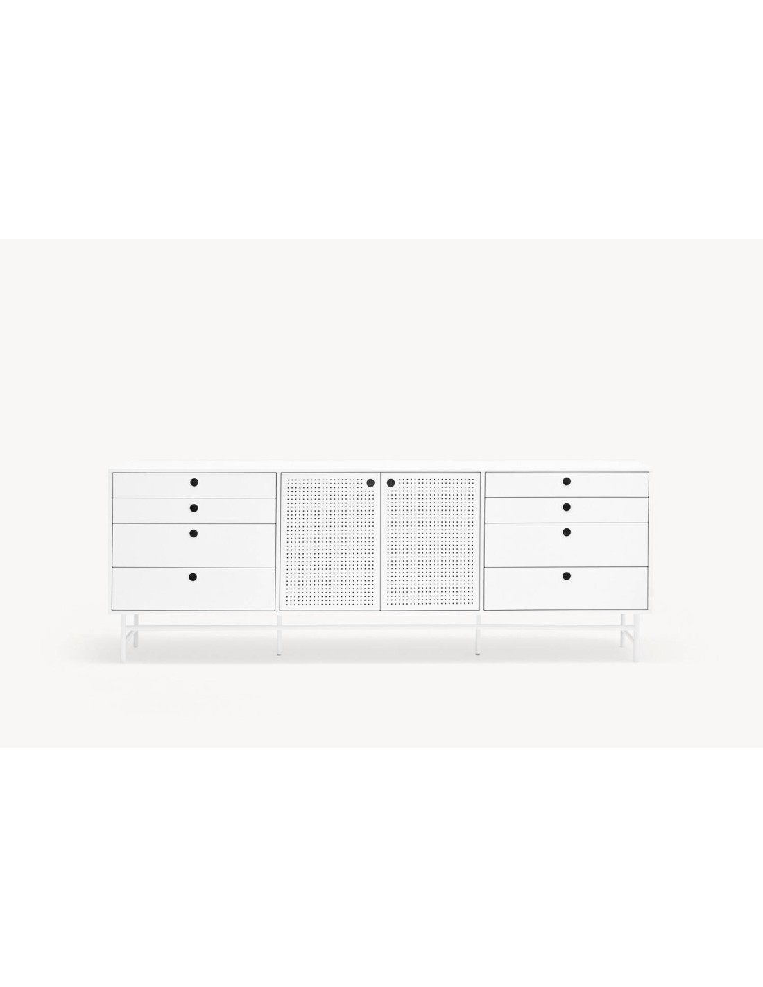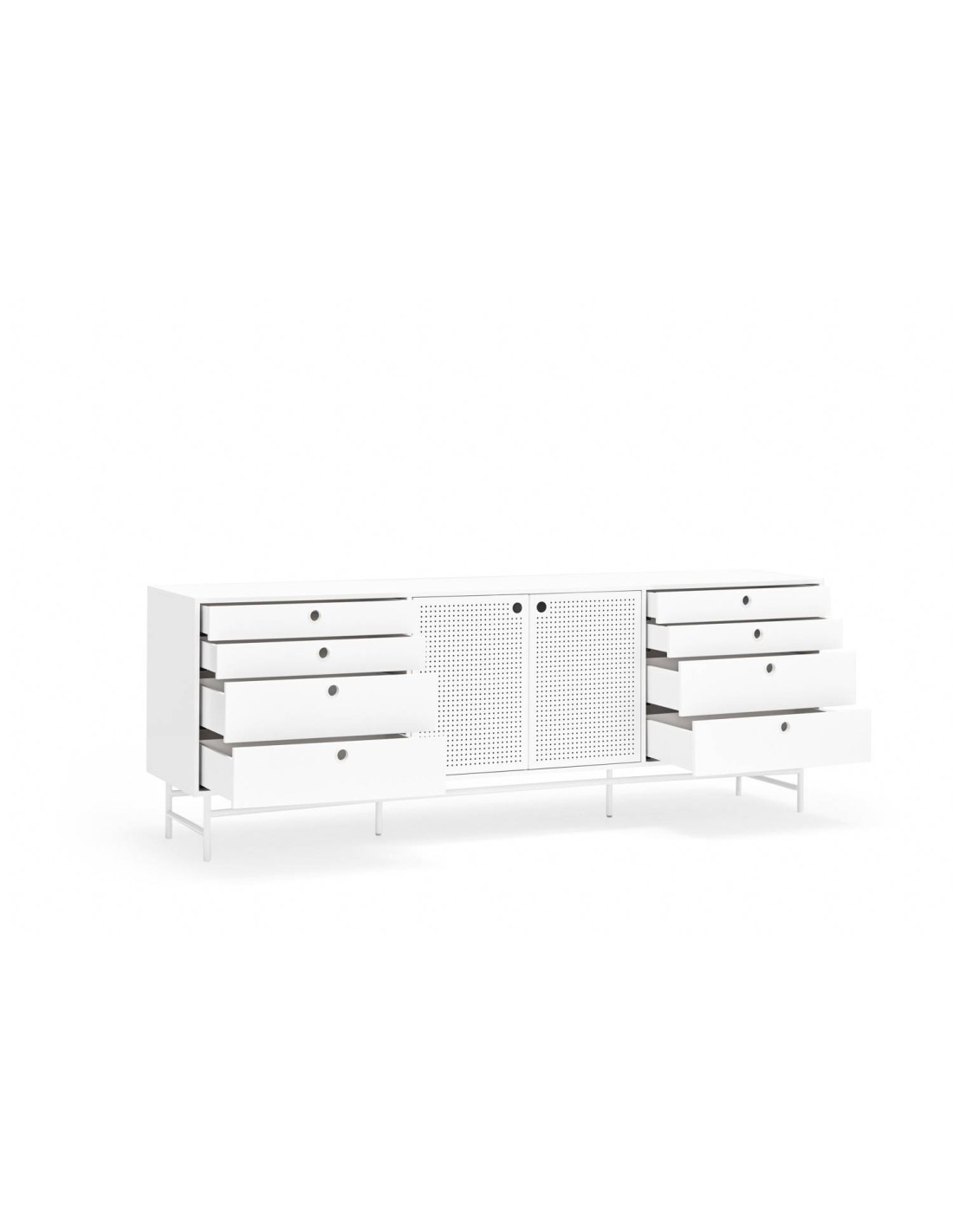 El aparador Punto consta de dos puertas y ocho cajones. En el interior encontramos dos baldas, complementando así el amplio espacio de almacenamiento del mueble.