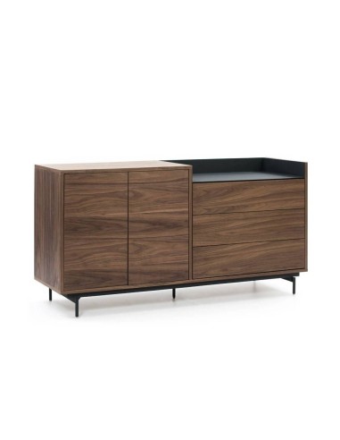 Aparador de diseño moderno. Esta construido en DM chapado en nogal y recubrimiento metálico para la parte superior en color azul oscuro.El aparador Valley tiene dos puertas con apertura push y balda en el interior para una mejor organización del espacio. Además cuenta con tres cajones que complementan las opciones de almacenaje. Valley permite al usuario disponer de espacio a dos niveles sobre los que colocar sus objetos y pertenencias con la calidez de la madera y la elegancia del metal.