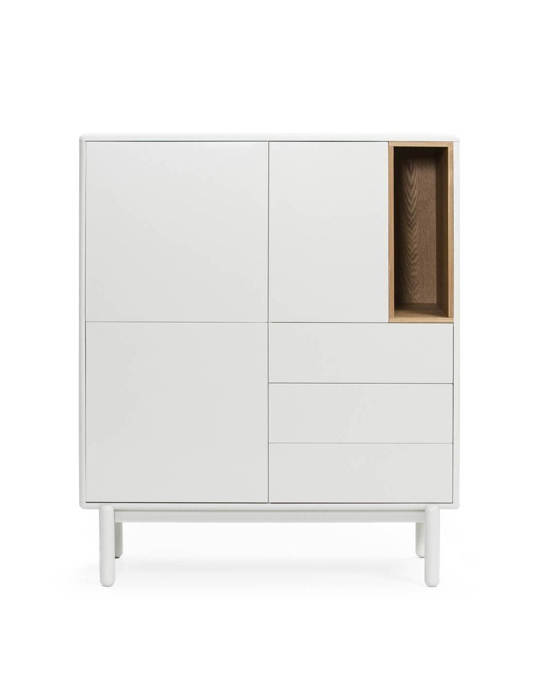 Mueble auxiliar de diseño moderno Corvo. Formado por tres puertas, tres cajones y un nicho vertical. Está realizado en MDF lacado en color crema, a excepción del nicho, chapado en roble. La silueta redondeada del mueble, hace que Corvo sea una colección de aspecto suave y voluminoso. A su vez, esto es lo que permite que todas las piezas queden integradas de manera precisa sin necesidad de piezas extra, generando un aspecto mucho más limpio y cuidado.