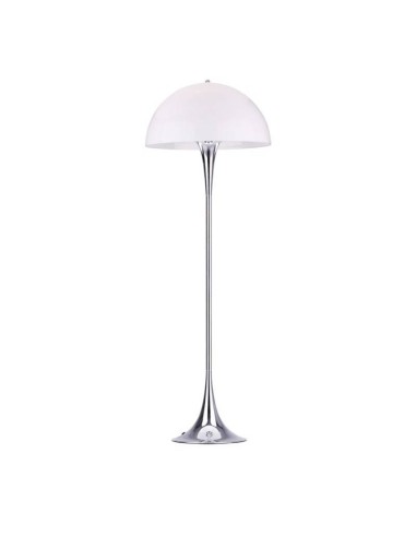 La lámpara de pié un famoso diseño de la década de los 70. Base metal cromado. Pantalla metálica de color blanco. Presenta una forma orgánica y bien equilibrada y está integrada por una pantalla hemisférica con distribución de la luz suave y agradable. La versión de metal dirige la luz hacia abajo y produce una iluminación suave y agradable.