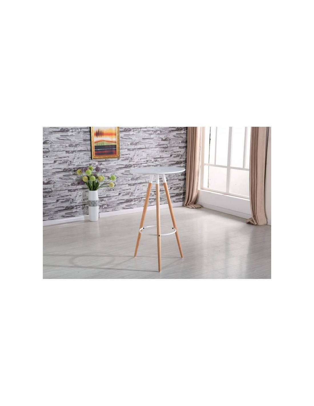 Mesa alta de diseño nórdico. Base de 3 patas de madera maciza. Tapa de madera lacada en blanco, formato redondo. Reposapiés cromado Con esta mesa tendrás una opción práctica y perfecta para cualquier espacio.¡Un must! diseñado para aportar un toque de personalidad y estilo allá donde lo necesites.