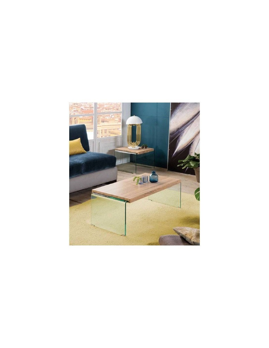 MESA DE CENTRO NEYDY 110x55,cristal curvado balda gruesa realizada en MDF con chapa sintética roble.