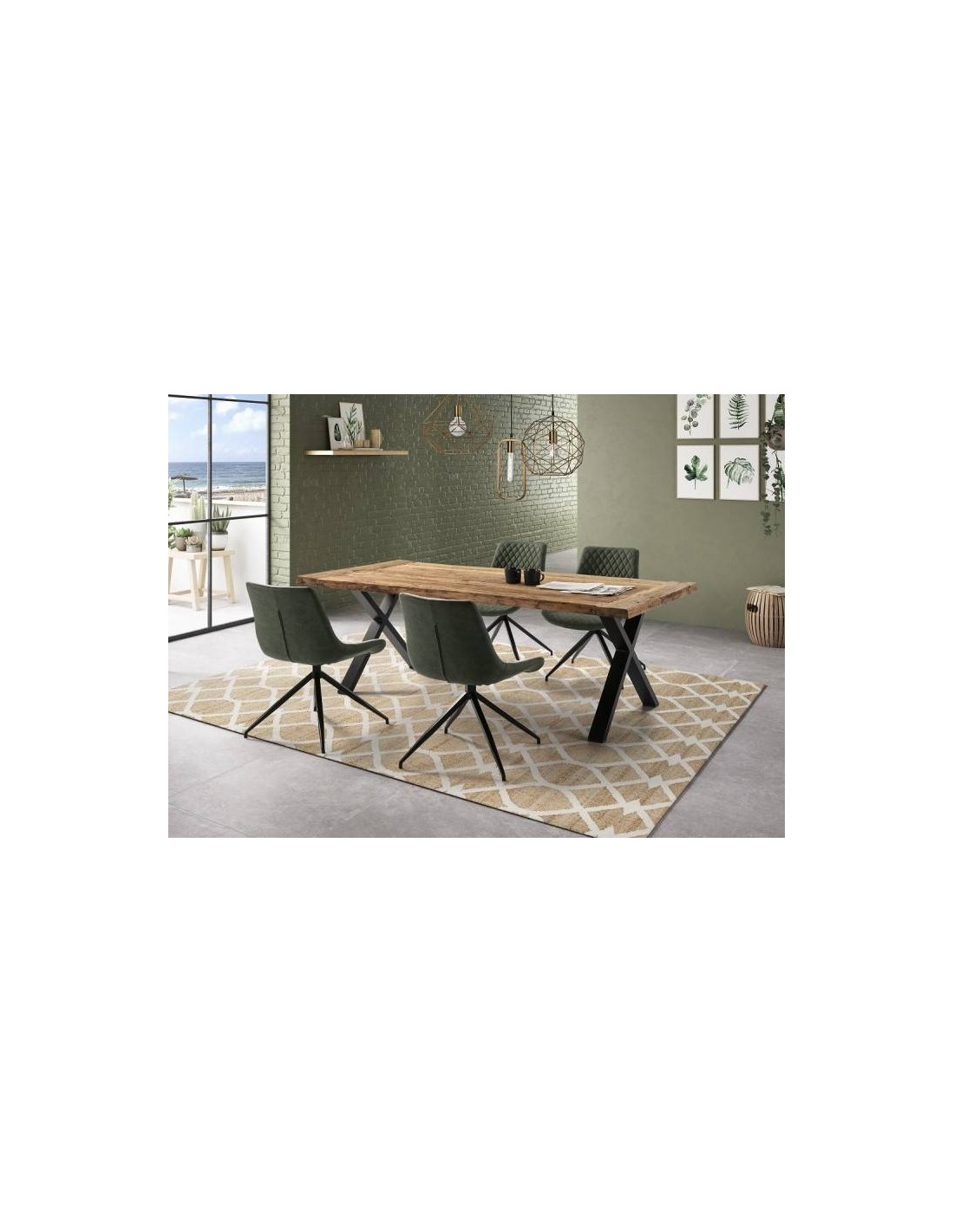 Mesa de comedor de diseño moderno industrial. Fabricada con gruesa tapa de madera de teka reciclada y con Pies metalicos pintado en negro mate.