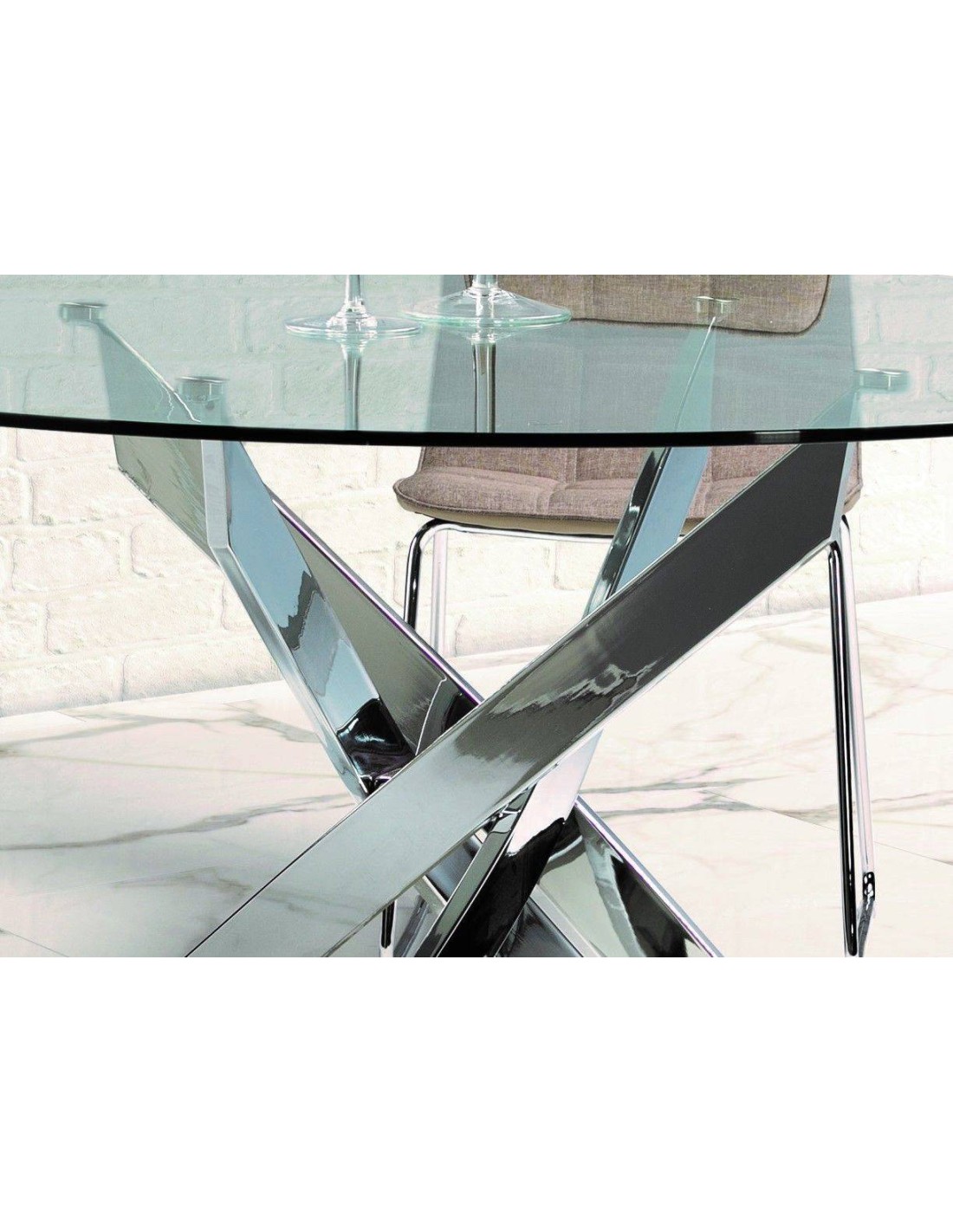Mesa redonda para comedor de diseño moderno. Compuesta de elegante estructura de metal cromado y funcional sobre de cristal templado de 120 cm de diametro. La original y moderna forma de sus pies son el toque final para completar un conjunto maravilloso. Con un diseño de aspecto distinguido que le aportará a su salón, ese toque chic que tanto le caracteriza.