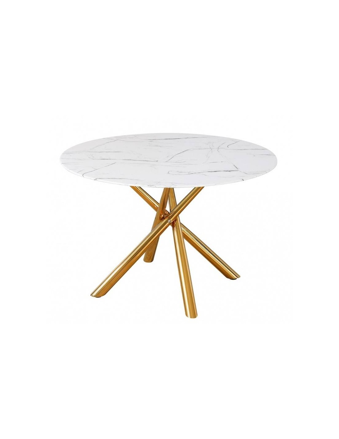 Mesa redonda HARA 120, tapa de cristal efecto mármol, pies metal Dorado