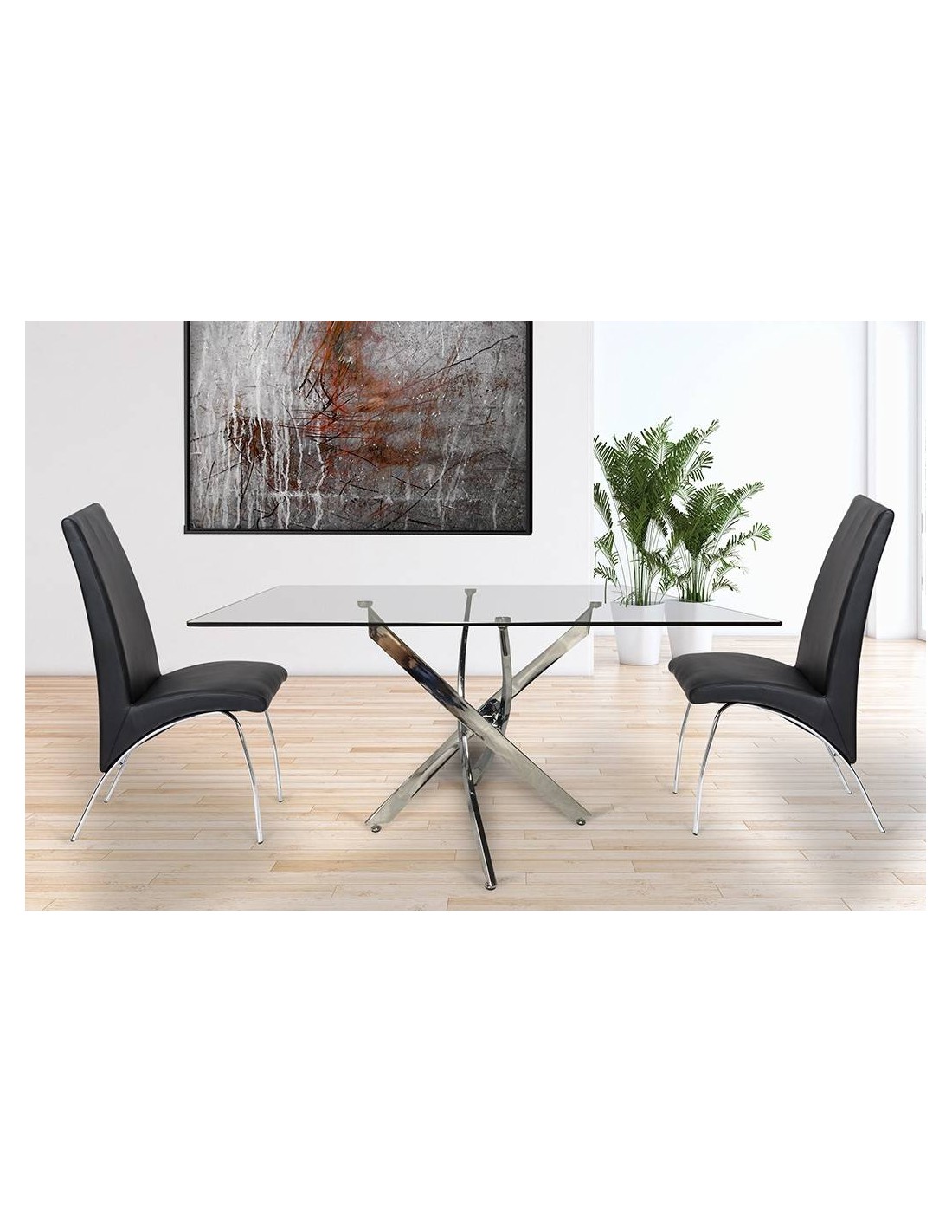 Original mesa de diseño moderno. Fabricada con estructura metal cromado. Sobre rectangular fabricado en cristal TEMPLADO de 1 cm. con sujeción laser. Metal y cristal, dos materiales tan robustos como elegantes. En esta mesa se alían a la perfección por lo que le confieren mucha personalidad y elegancia.