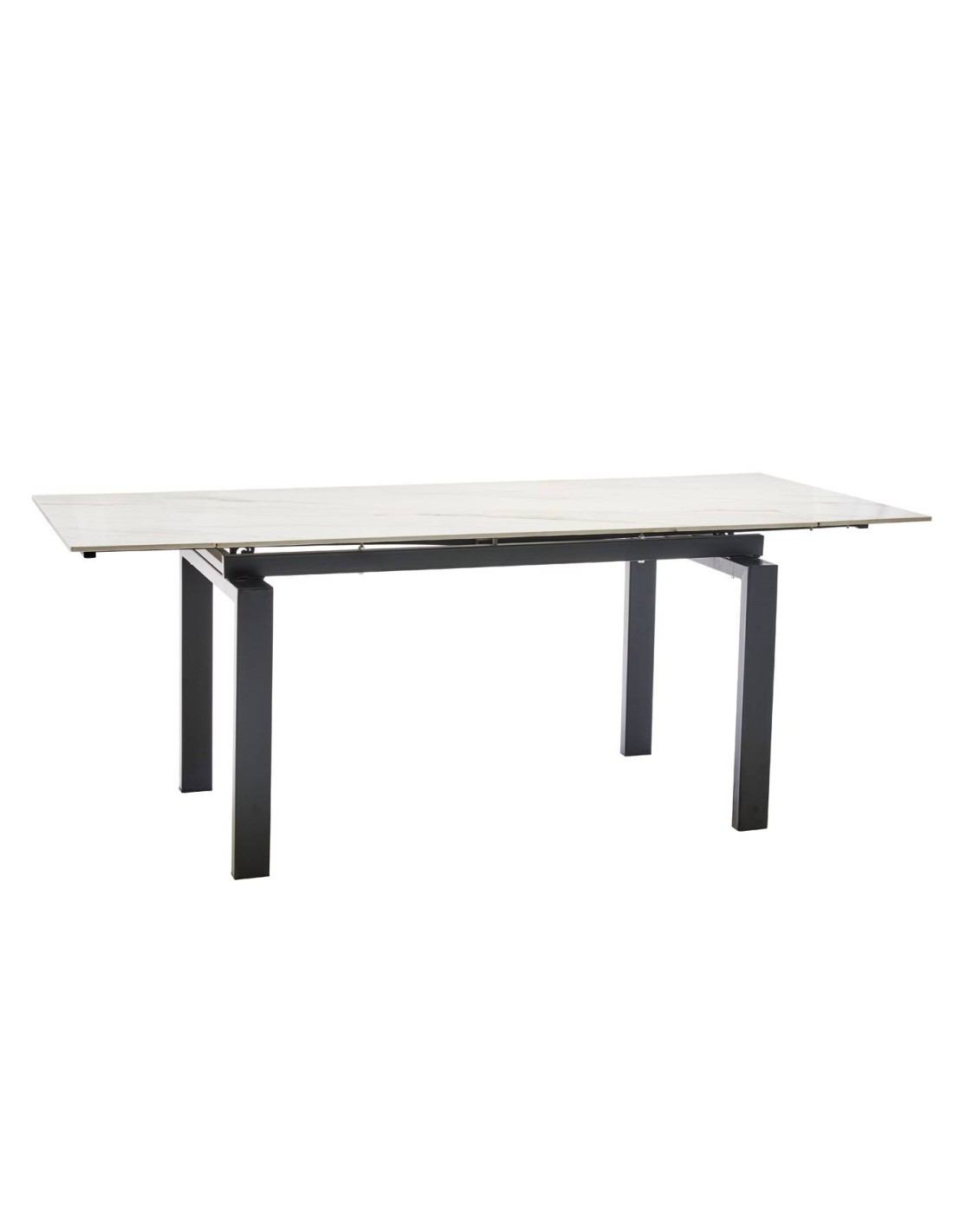Mesa extensible de diseño moderno. Fabricada con sobre cerámico terminado en blanco veteado y estructura de metal negro terminado en mate. Una mesa extensible que combina modernidad y funcionalidad. La combinación de materiales y colores le da a esta mesa un estilo contemporáneo que se adapta bien a una variedad de entornos de comedor, desde los más modernos hasta aquellos con un toque más tradicional.