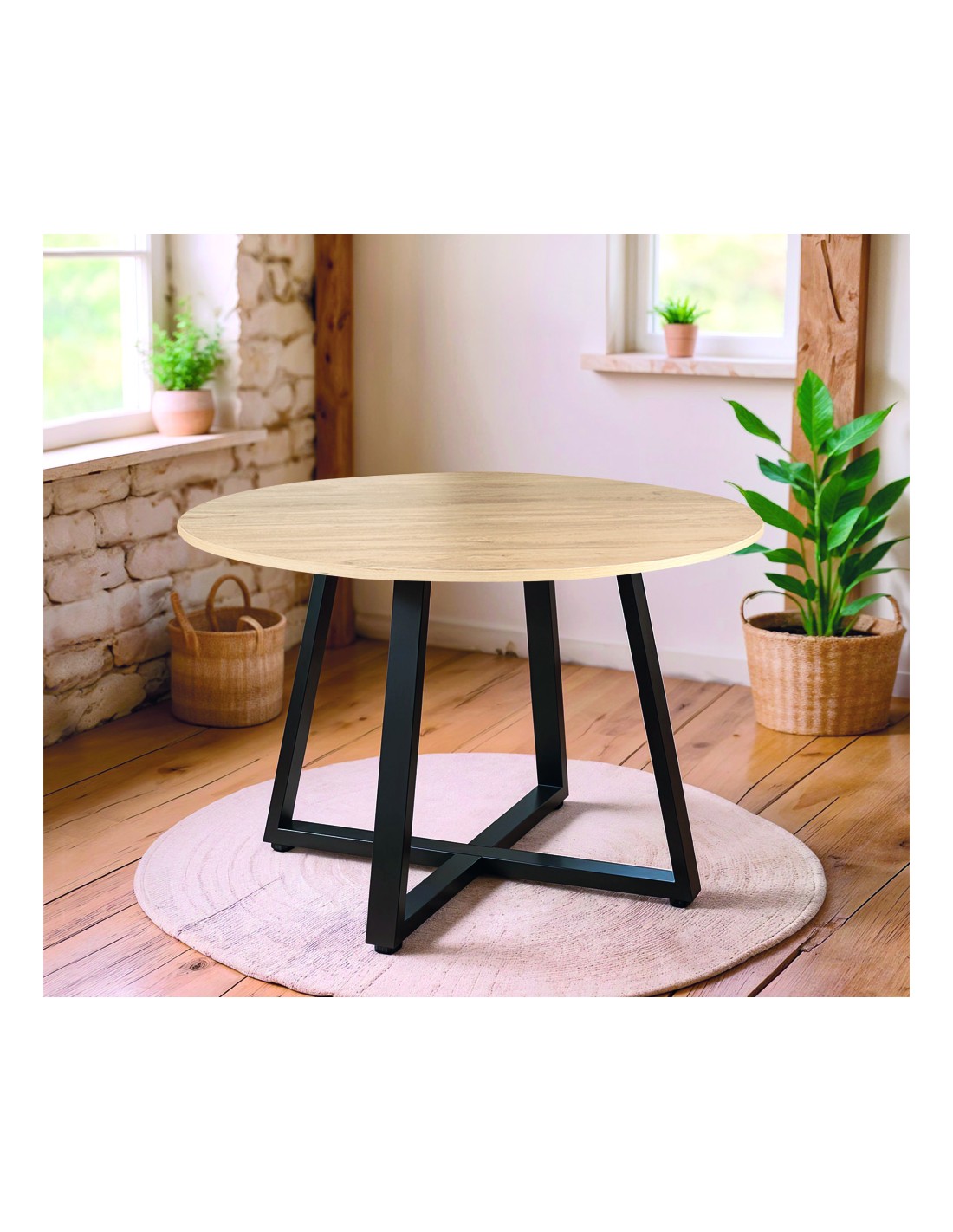 La Mesa Redonda TRAPELIA 120 cm Roble Amazonia con Patas Metálicas Negras combina estética, funcionalidad y resistencia para adaptarse a los hogares actuales.