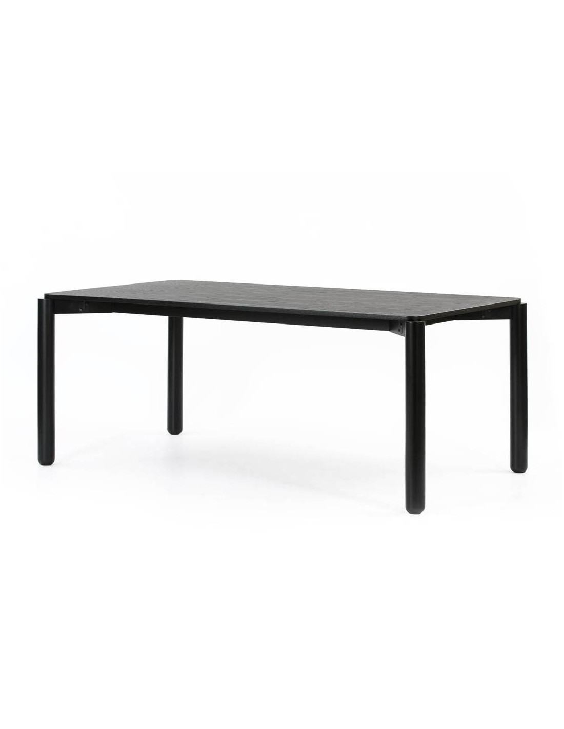 Mesa para salón comedor de diseño minimalista. Las patas están realizadas en madera maciza y el sobre de DM esta chapado en fresno natural o tintado en negro. Compuesta de 4 patas con un ligero desfase y rematadas con un pie redondeado, las cuales dan soporte al tablero rectangular. Simulando permanecer en un equilibrio constante, la mesa Atlas es una pieza robusta y resistente, donde la contraposición de conceptos aparentemente opuestos conviven en ella, aportándole un atractivo único.