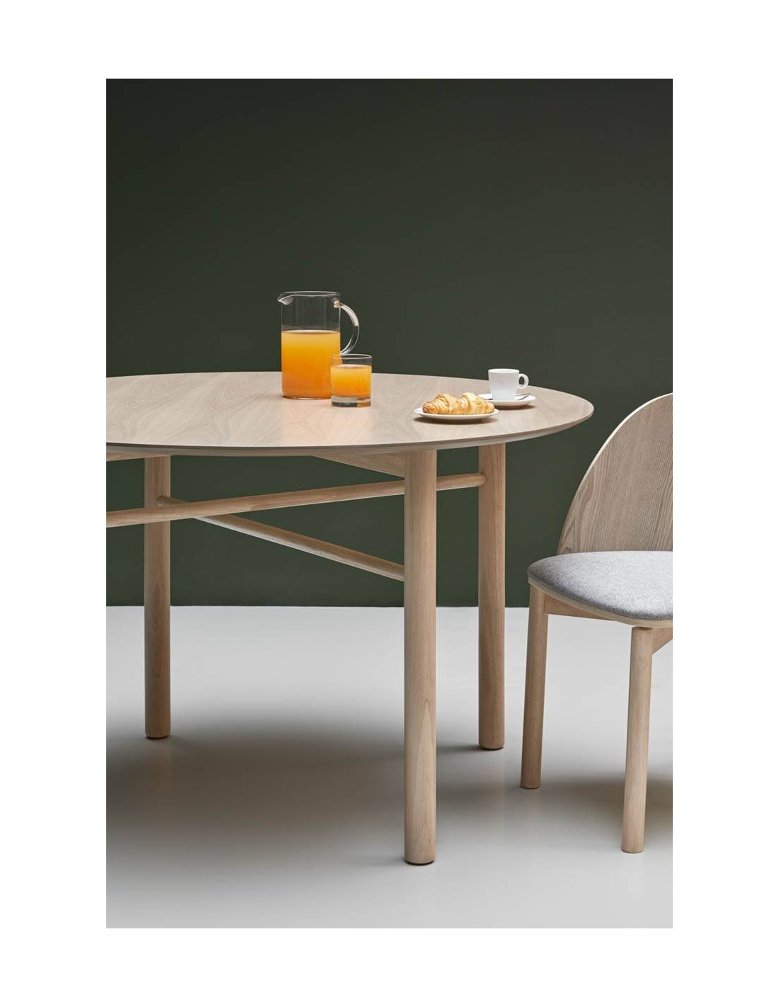 La mesa redonda Junco presenta 4 patas unidas de dos en dos mediante traveseras cilíndricas de madera. Las traveseras se cruzan sin llegar a cortar entre ellas. El sobre presenta un leve rebaje que lo aligera visualmente. Está realizada en MDF chapado en fresno natural y las patas son madera maciza con un redondeo en el inferior. Se ha buscado generar una silueta estilizada, mínima y elegante.