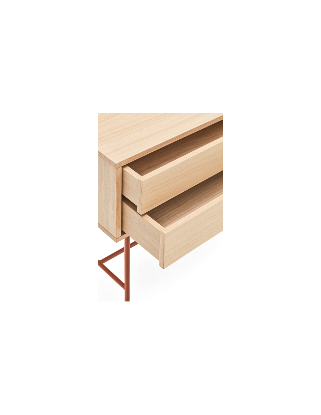 Consola recibidor de diseño minimalista moderno realizado en chapa de roble natural color claro y combinado con lacado en color TEJA, sobre una base con pies metálicos retranqueados lacados en el mismo tono. Dispone de 2 huecos lacados en crema. Yoko combina la naturalidad de la madera con detalles en color, haciéndola perfecta para encajar en distintos ambientes.