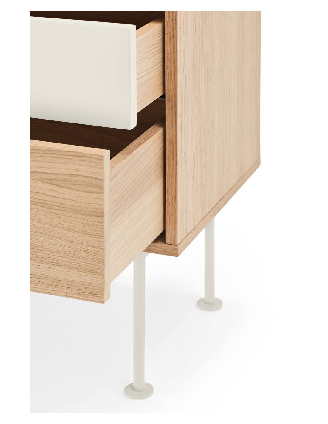 Mesita auxiliar de diseño minimalista moderno realizado en chapa de roble natural color claro y combinado con lacado en color crema, sobre una base con pies metálicos retranqueados lacados en el mismo tono. Dispone de 2 cajones uno lacado en crema y otro terminado en roble. Yoko combina la naturalidad de la madera con detalles en color, haciéndola perfecta para encajar en distintos ambientes.
