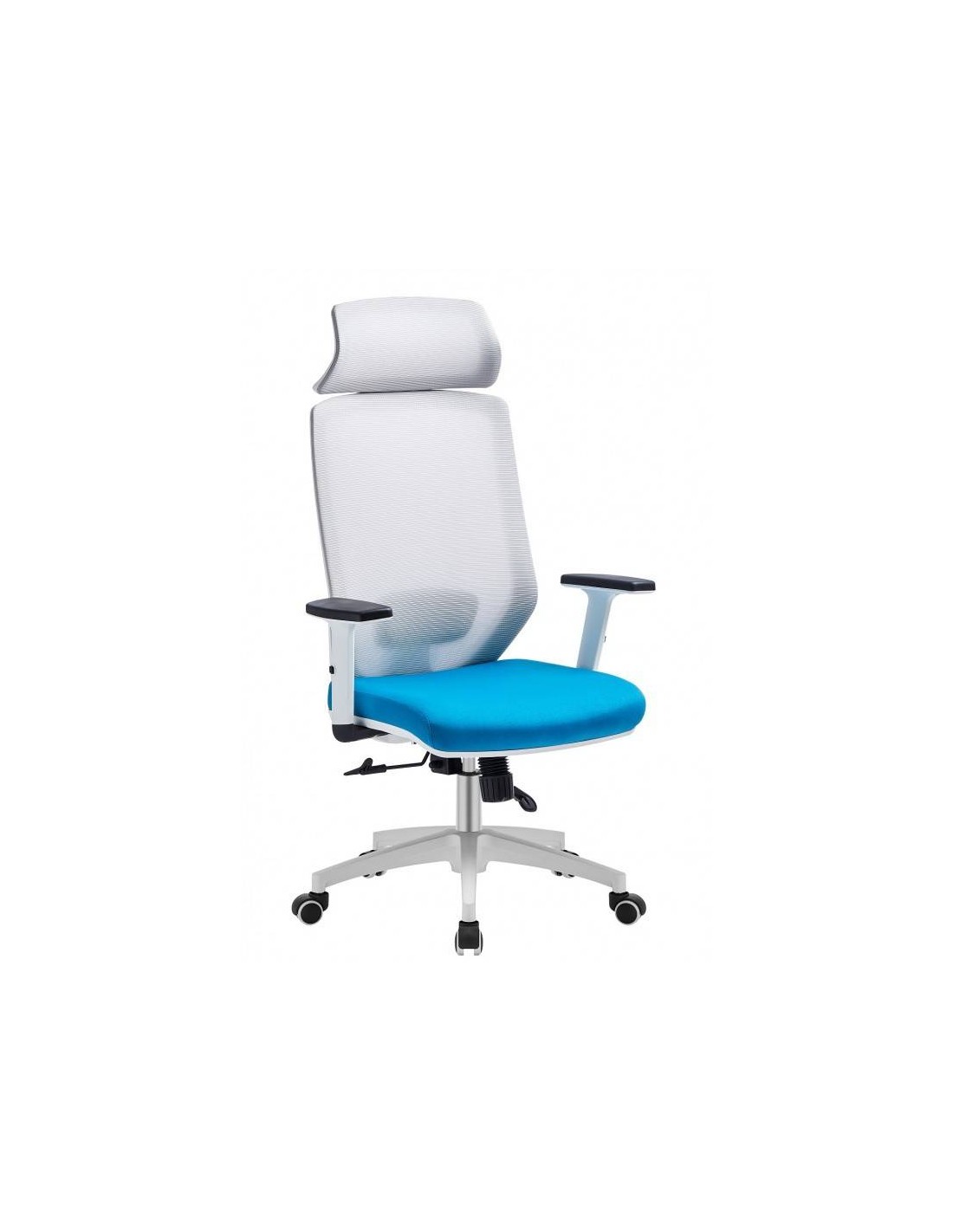 Sillón de oficina moderno con cabezal con elevación por pistón a a gas. Mecanismo de sincronización con mando y regulación. Armazón y base de polipropileno reforzado con fibra de vidrio de color blanco. Brazos regulables en altura. Tapizado del respaldo en malla con diseño horizontal de color gris, asiento en tejido acrílico en colores negro o azul. Su diseño y estilo hace que encaje en todos los interiores marcados por las últimas tendencias.