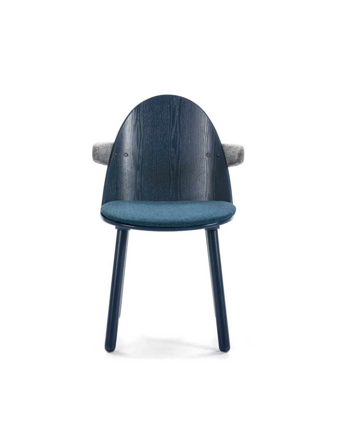 Silla con brazos para comedor de diseño moderno. Realizada totalmente en madera recuperando técnicas de ebanistería tradicional terminado en azul. Cojín tapizado en tela azul y brazos tapizados en tela gris. Uma pretende emocionar con su estética. Nace de una sutil combinación de líneas curvas y rectas y la búsqueda de sencillez y ligereza visual sin renunciar a la confortabilidad.