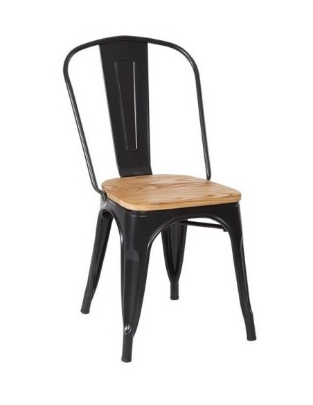 Silla apilable de estructura de acero acabado en pintura epoxi de color negro. Con tratamiento previo de fosfatado. Asiento de madera de olmo con acabado natural. Magnífica silla de dseño contemporaneo para las casas modernas.