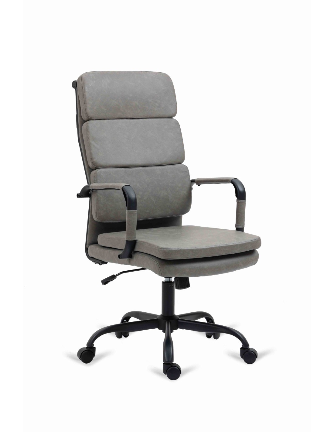 Silla de oficina de respaldo alto que ofrece máximo confort con su asiento y respaldo acolchados soft, tapizados en elegante polipiel gris. Su estructura en negro mate no solo añade robustez sino también un toque chic y contemporáneo a cualquier oficina. Perfecta para largas jornadas de trabajo con estilo y comodidad.