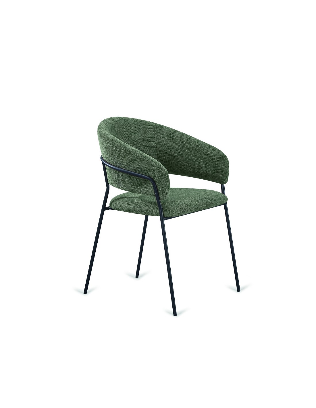 La base del sillón está formada por patas metálicas en color negro mate, lo que garantiza estabilidad y una estética moderna muy valorada en el diseño actual.
