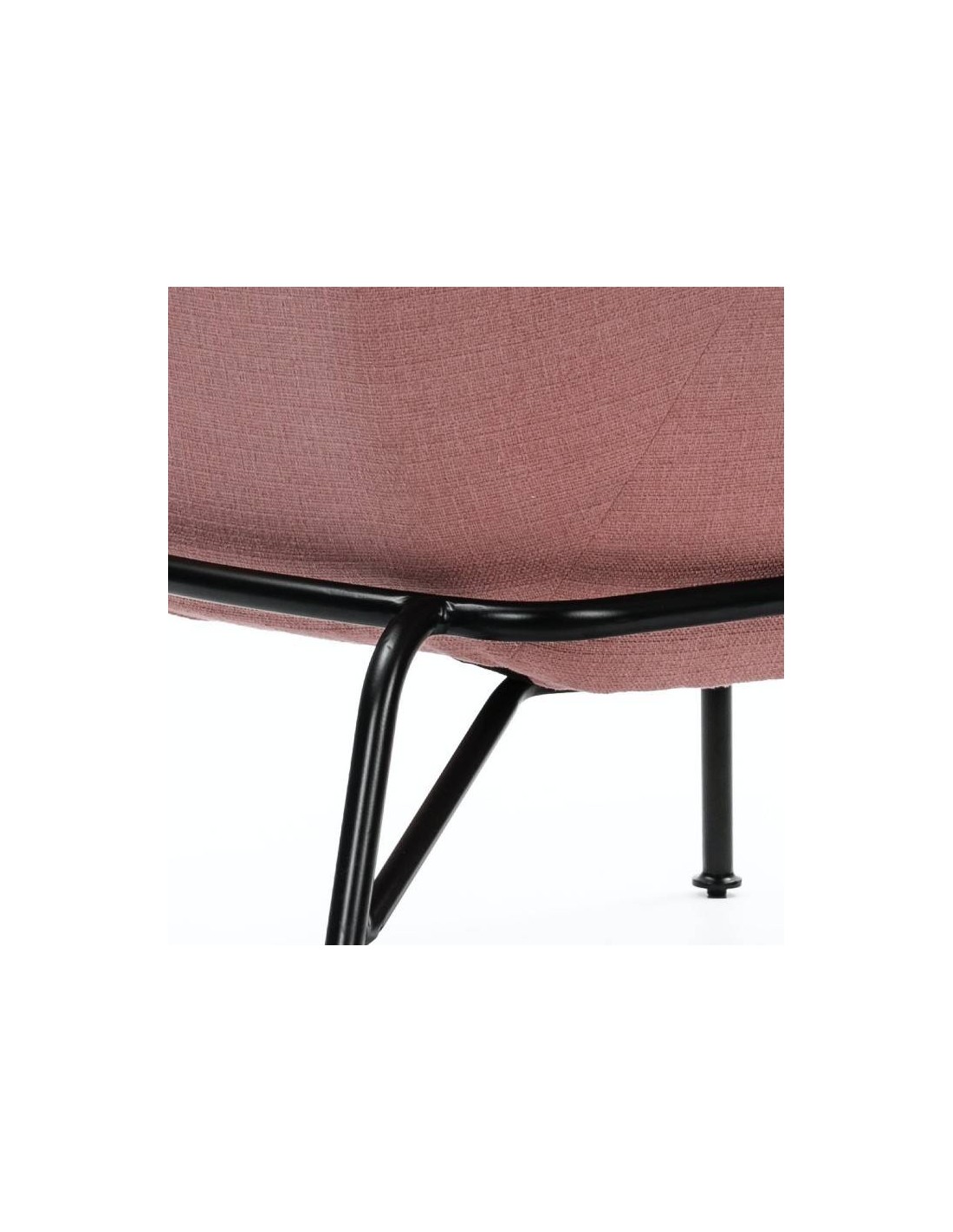 Butaca de diseño tapizado en tela color coral. Pies en metal color negro. Esta butaca sigue la tendencia de la estructura vista, propia del diseño contemporáneo, además de sus volúmenes asimétricos. Libre de ornamentos, es un diseño basado en la simplicidad y funcionalidad.