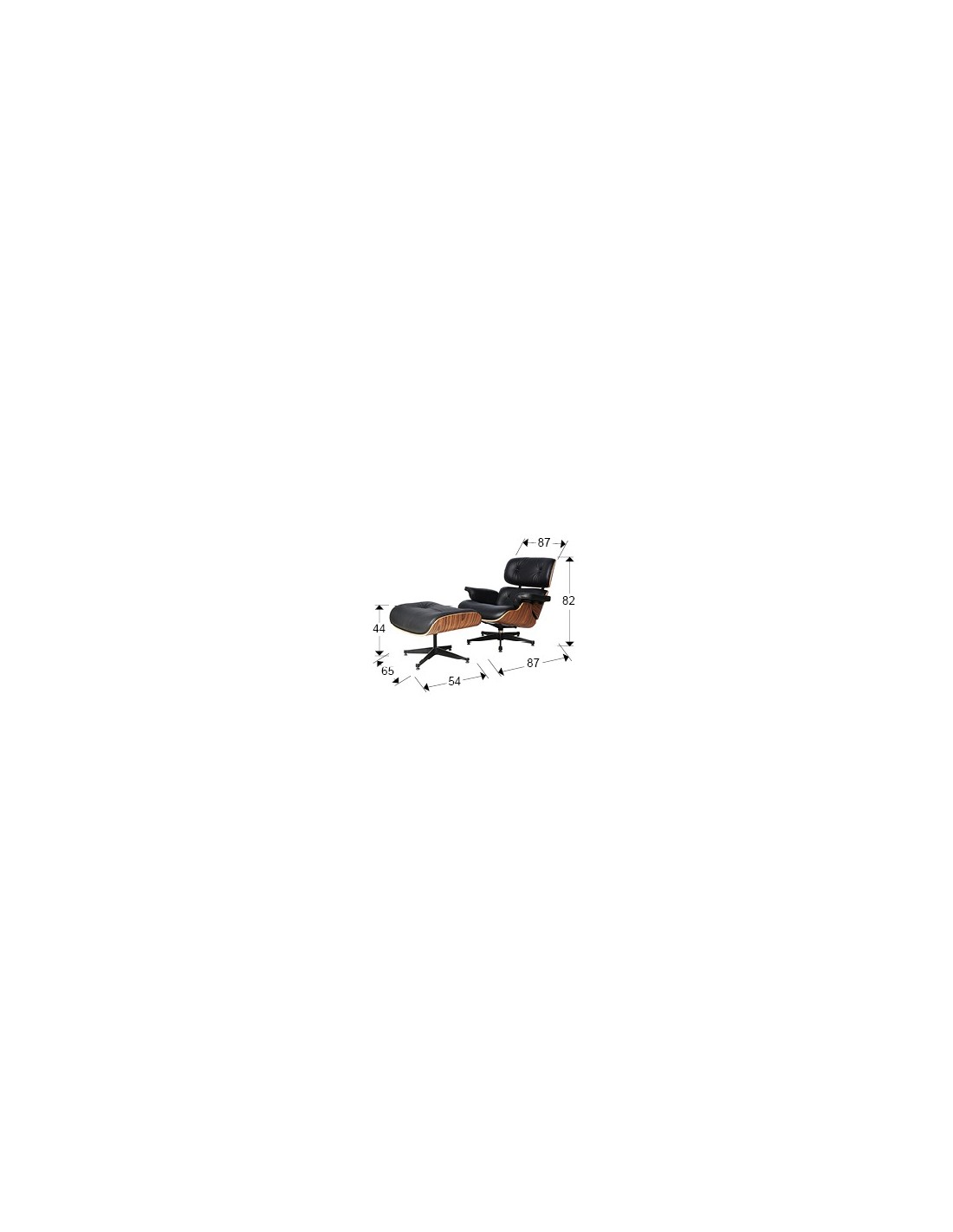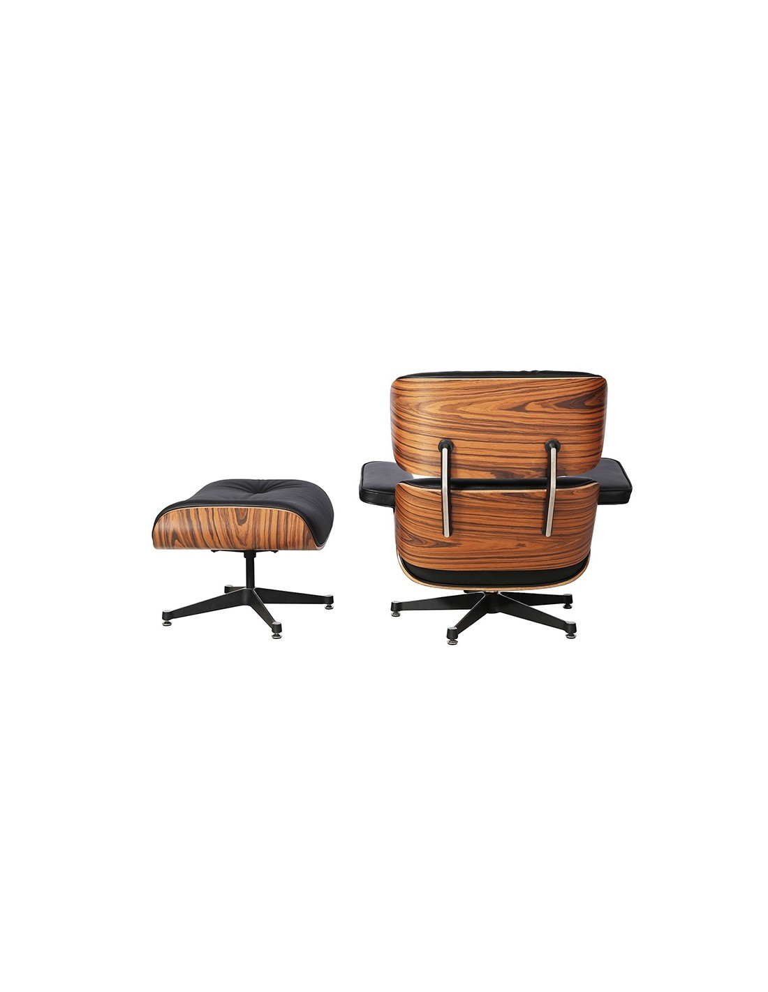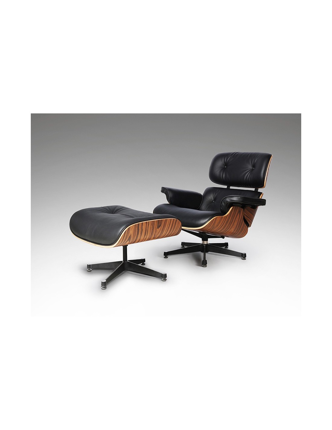 Sillón Lounge con ottoman, piel negra, madera palisandro y patas en aluminio acabado negro
