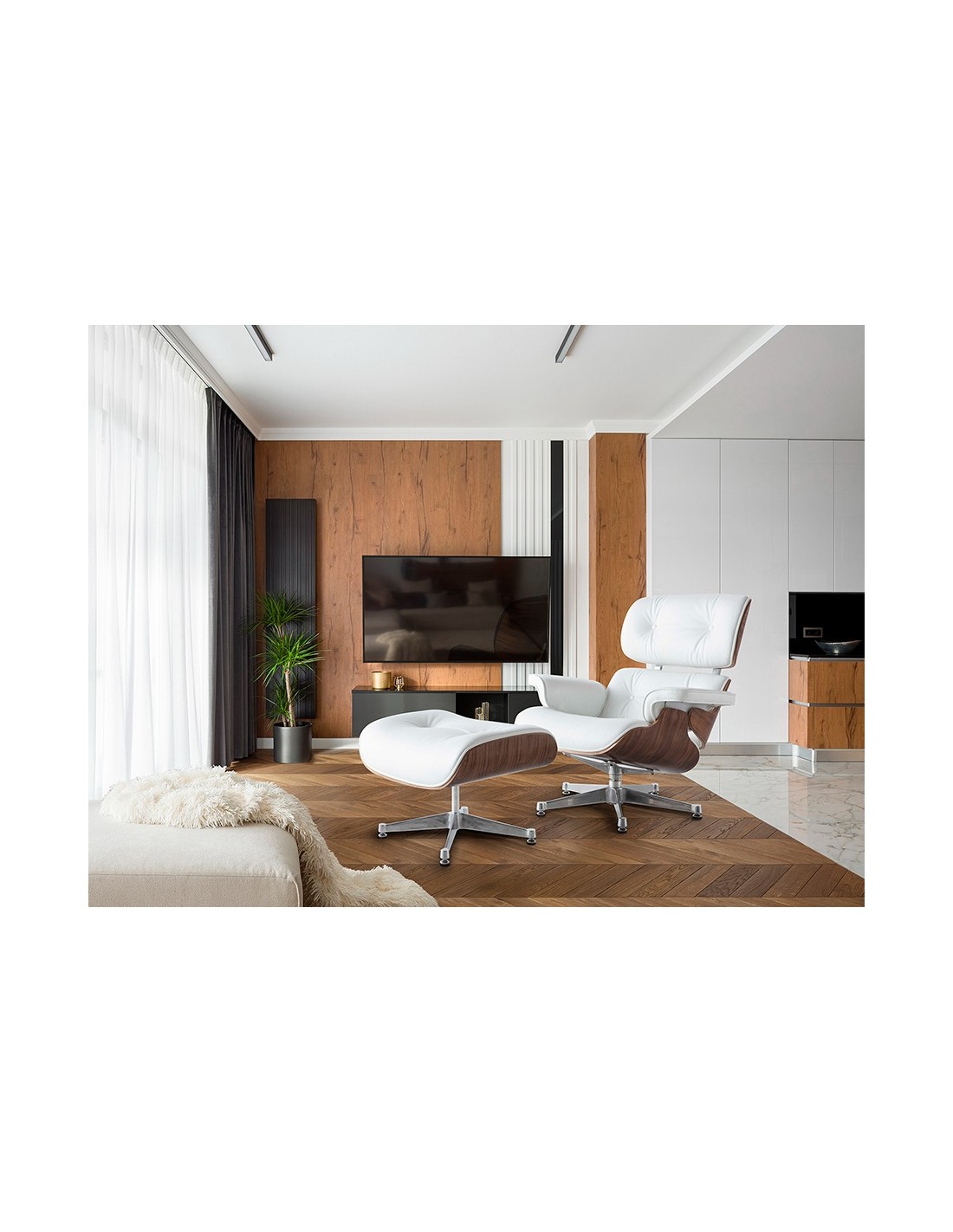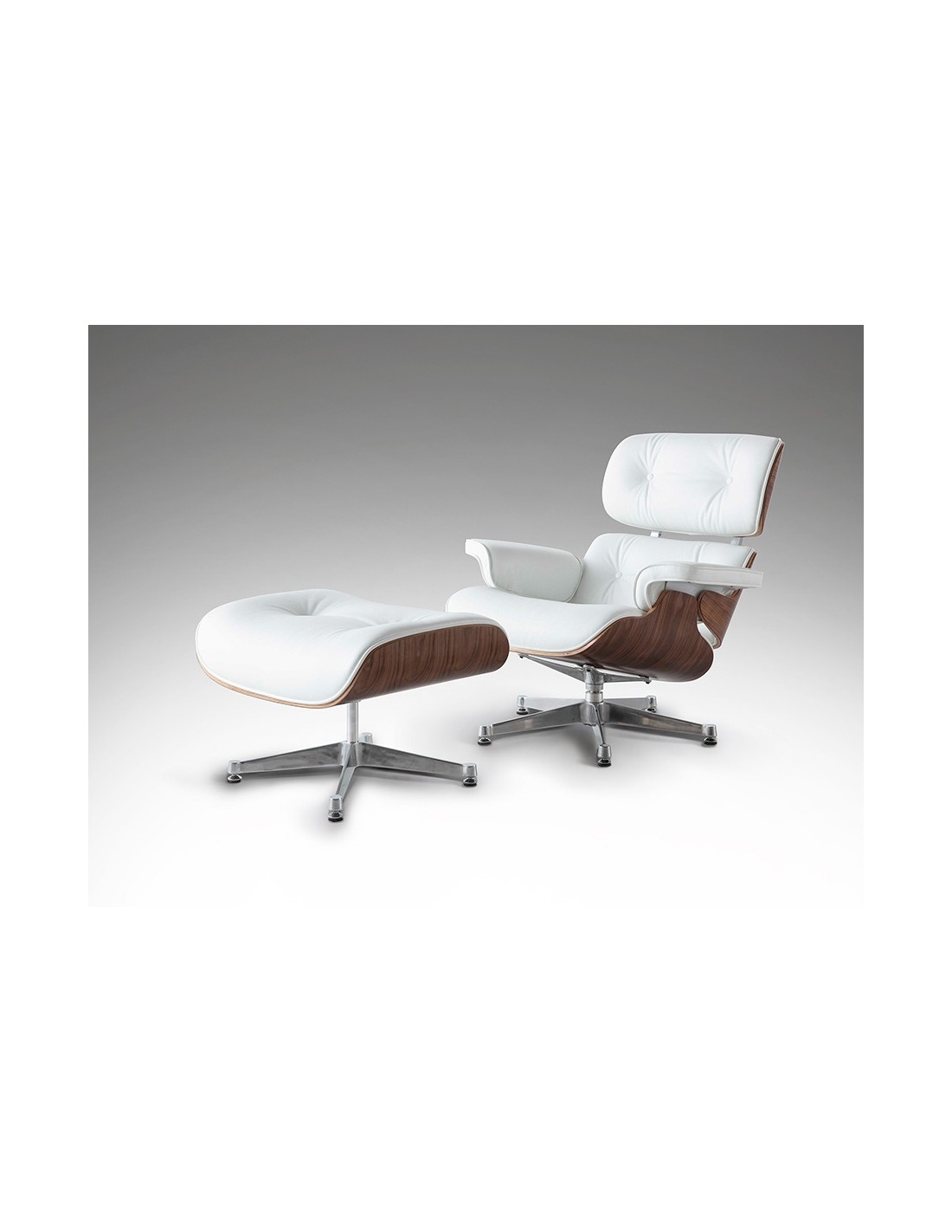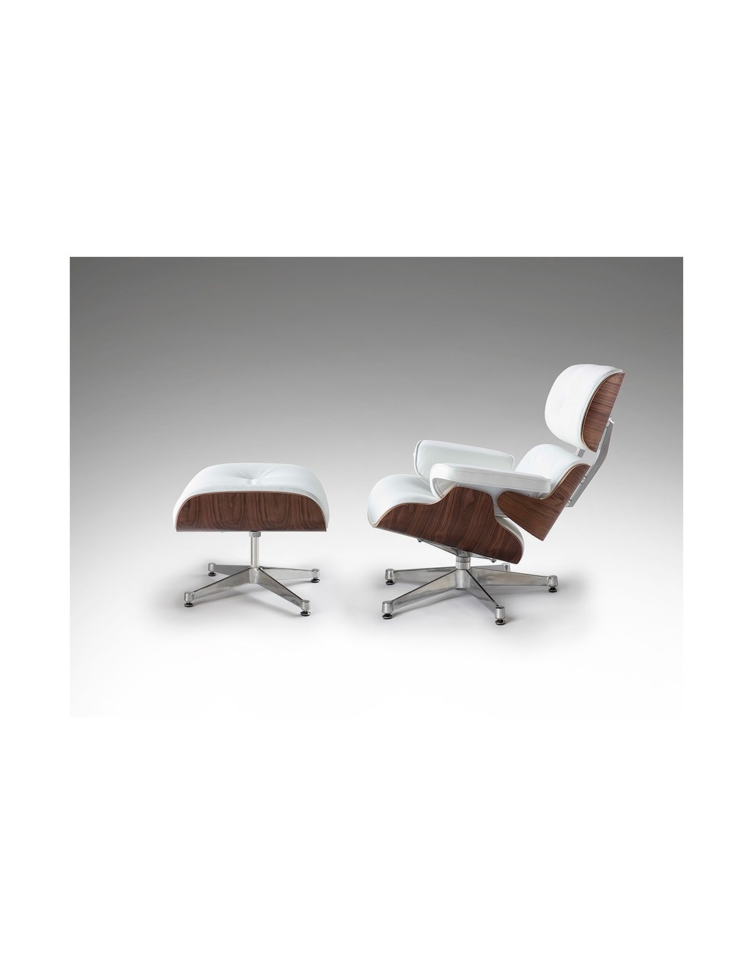 Sillón Lounge con ottoman, piel blanca, madera nogal y patas en aluminio pulido