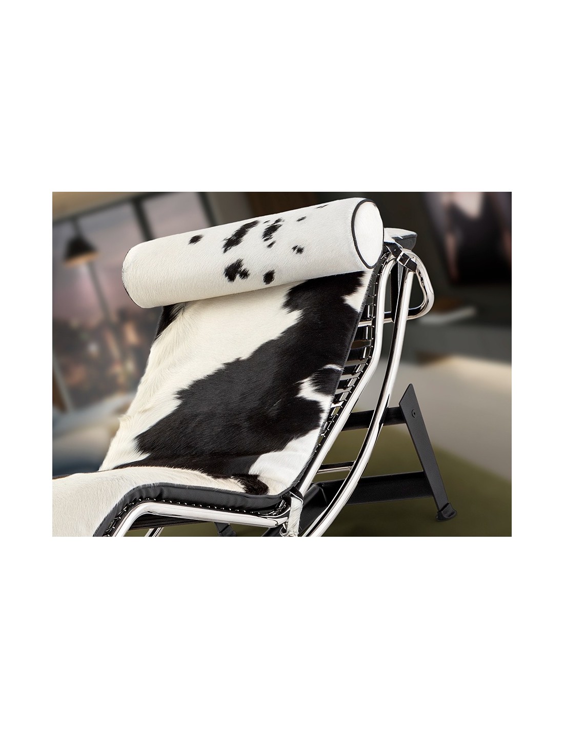 El asiento está tapizado en su cara anterior con piel de vaca natural con pelo en manchas blanco y negro, lo que convierte cada chaise longue en una pieza irrepetible. La cara posterior se reviste en polipiel para facilitar el mantenimiento sin renunciar a la estética.