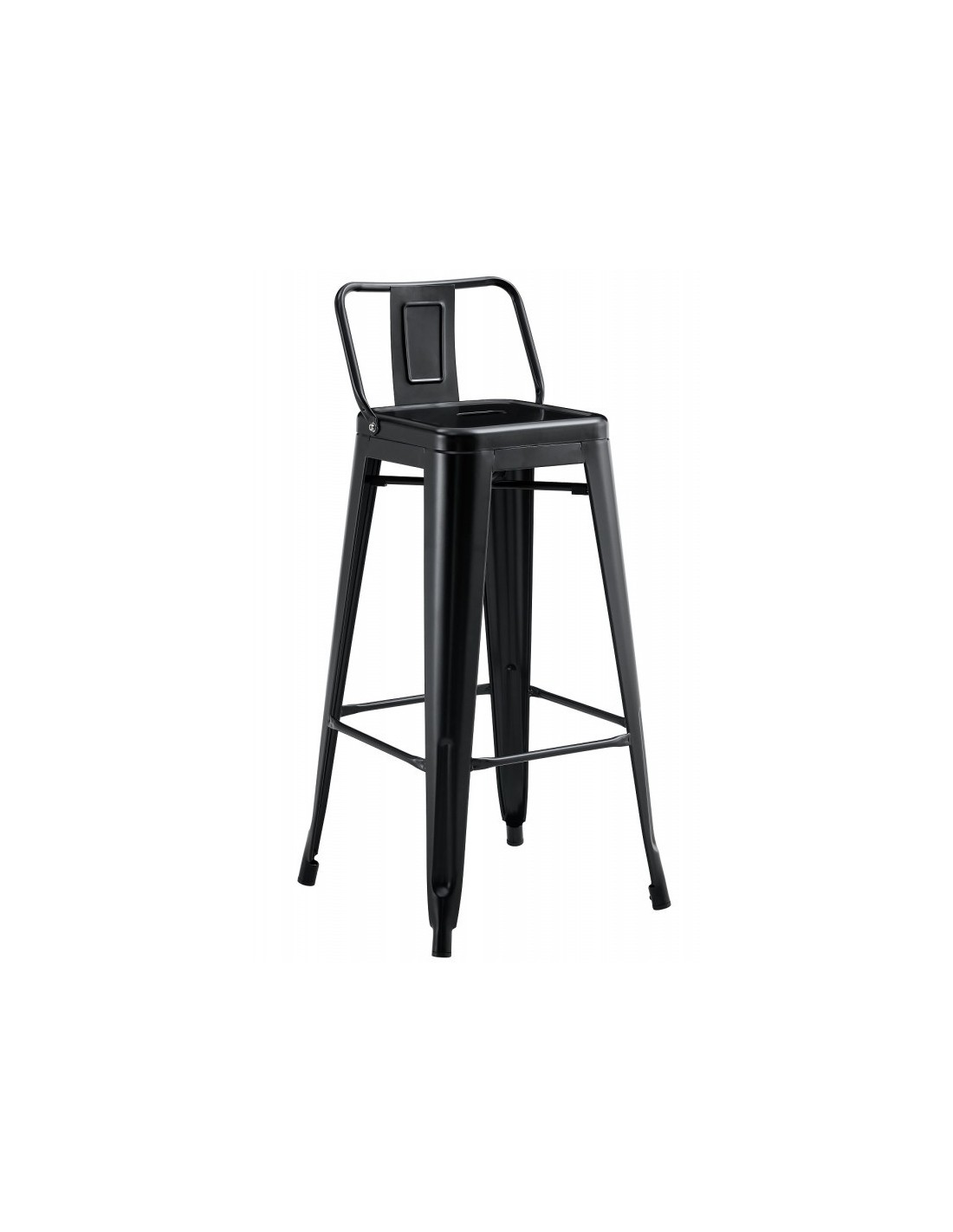 El taburete TOLIX con respaldo es una pieza de mobiliario versátil y elegante. Su estructura está fabricada en acero de color negro y cuenta con un respaldo que proporciona un soporte adicional y comodidad al usuario