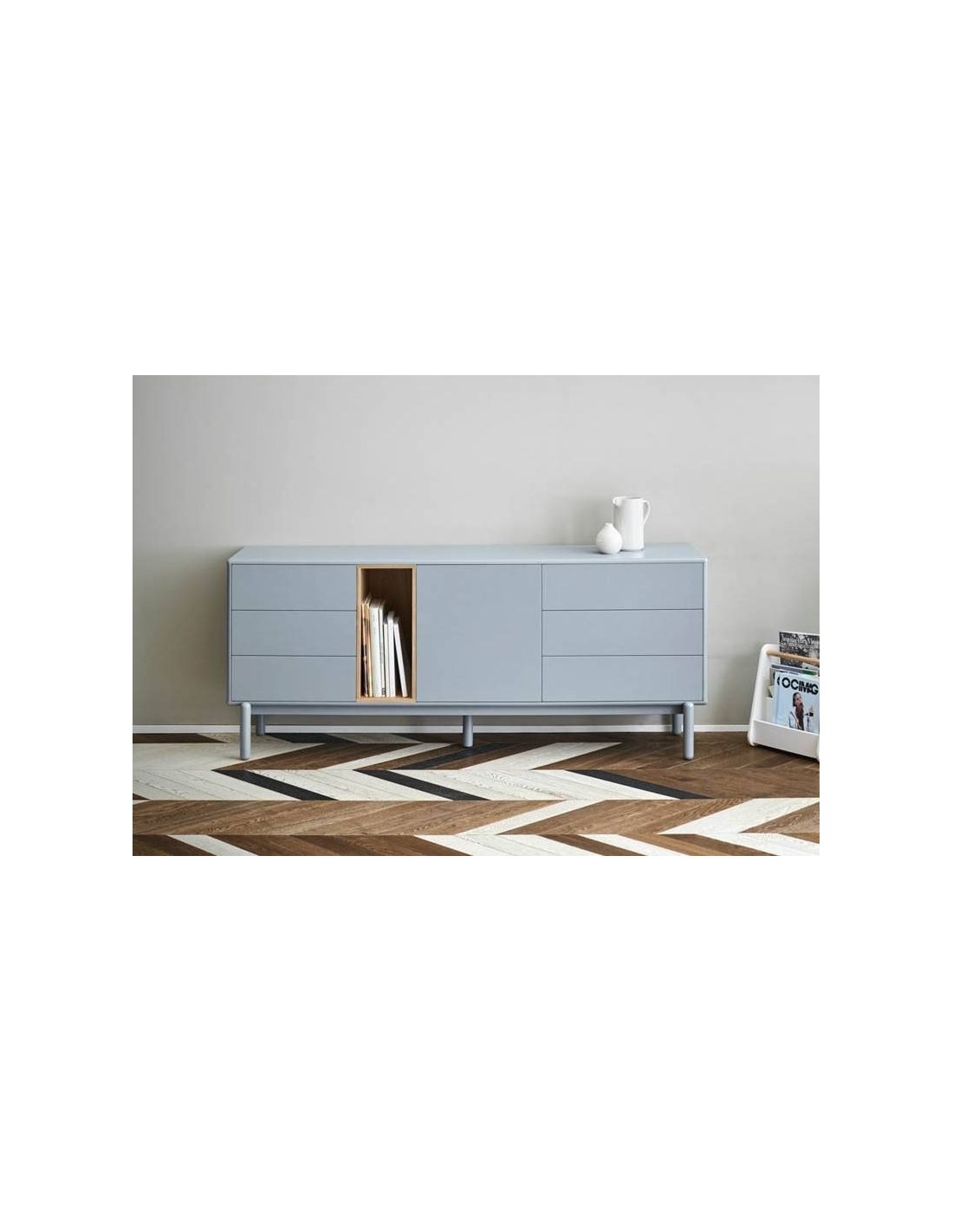 Armário auxiliar de design moderno Corvo. Composto por uma porta, seis gavetas e nicho vertical. Isto oferece uma ampla variedade de opções de armazenamento. É fabricado em MDF lacado em cor cinza pérola, à exceção do nicho, banhado em carvalho. A silhueta arredondada do armário, há que Corvo seja uma coleção de aspecto macio e volumoso. Por sua vez, isto é o que permite que todas as peças sejam integradas de maneira precisa, sem a necessidade de peças extras, gerando um visual muito mais limpo e cuidado.