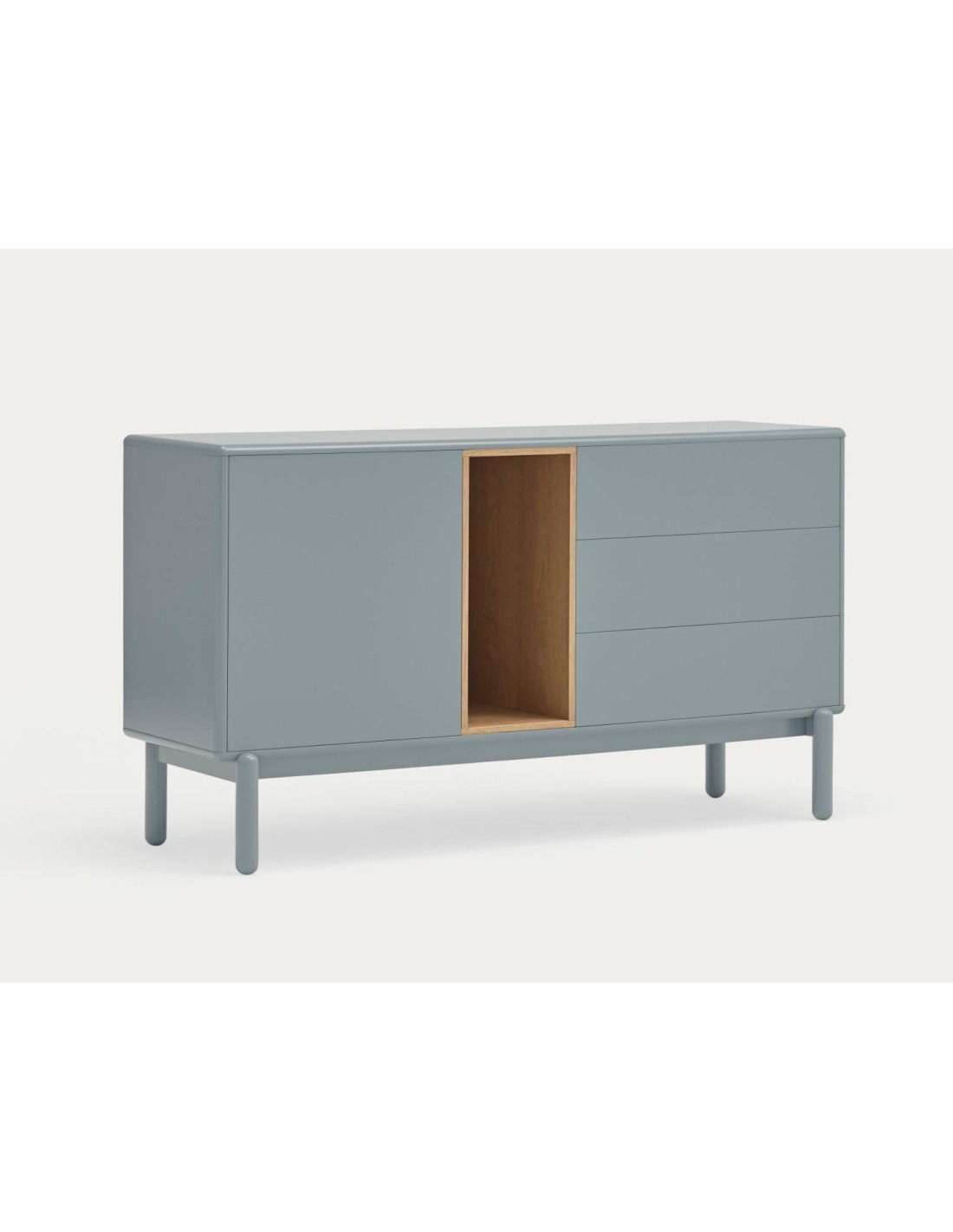 Aparador de design moderno. Fabricado em MDF lacado em cinza pérola, com exceção do nicho, folheado em carvalho. Composta por 3 gavetas push e uma porta com abertura interior com prateleira. A silhueta arredondada do mobiliário, torna o Corvo uma coleção de aparência suave e volumosa. Por sua vez, isto é o que permite que todas as peças fiquem integradas de maneira precisa sem necessidade de peças extra, gerando um aspecto muito mais limpo e cuidado.