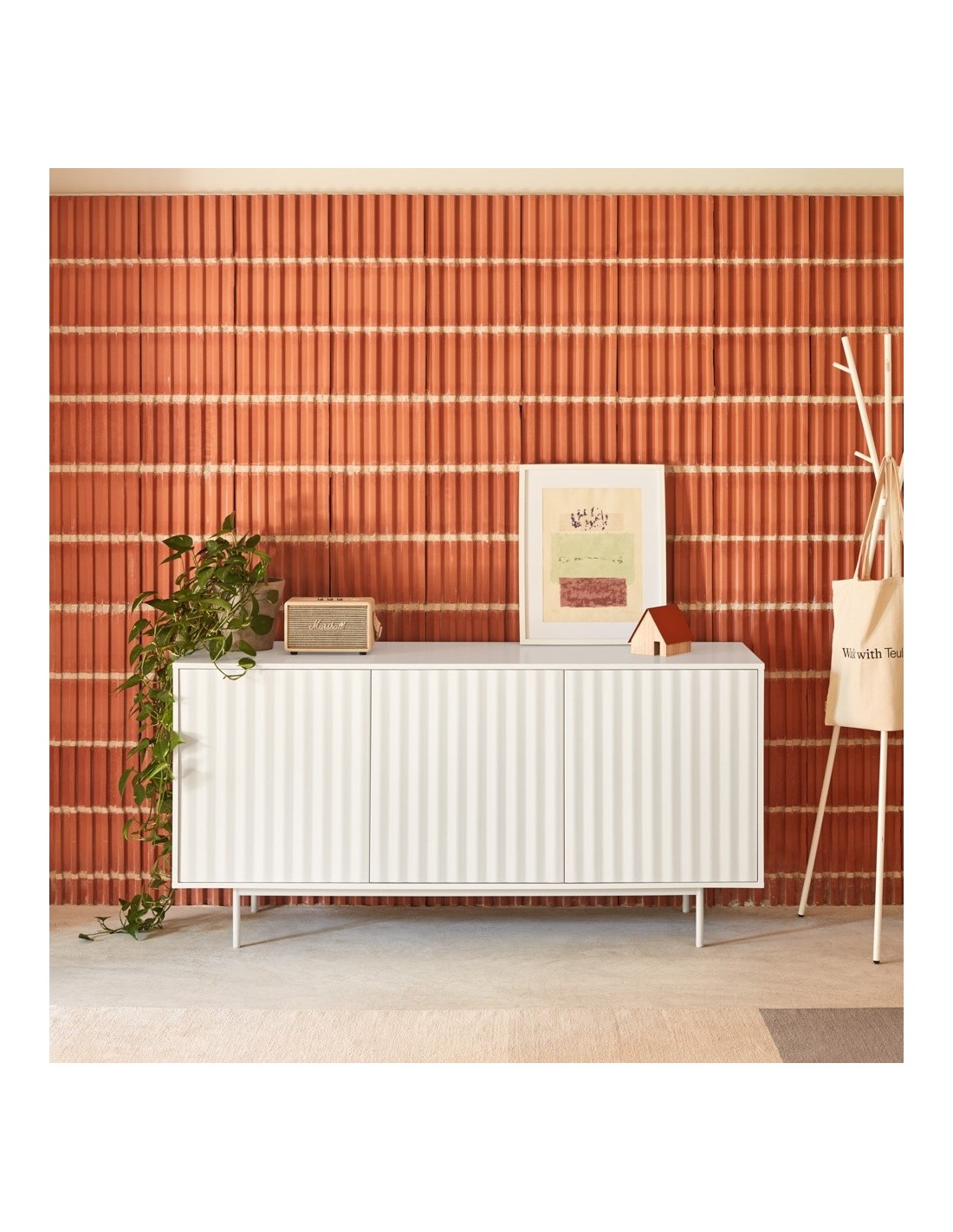 O aparador Sierra tem duas portas com a trama singular desta série e quatro gavetas. No interior, duas prateleiras complementam o espaço resultante.