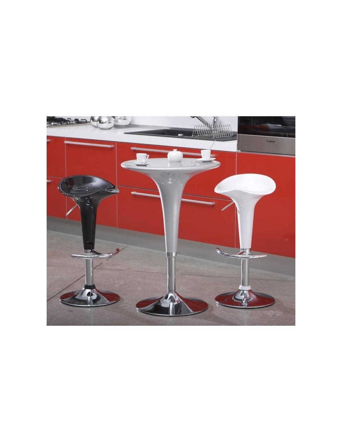 A base da banqueta, a coluna e o apoio para os pés são cromados, o que confere um toque de elegância e resistência. Além disso, este modelo está disponível em várias cores, para que possa escolher a que mais se adequa ao seu estilo e decoração.