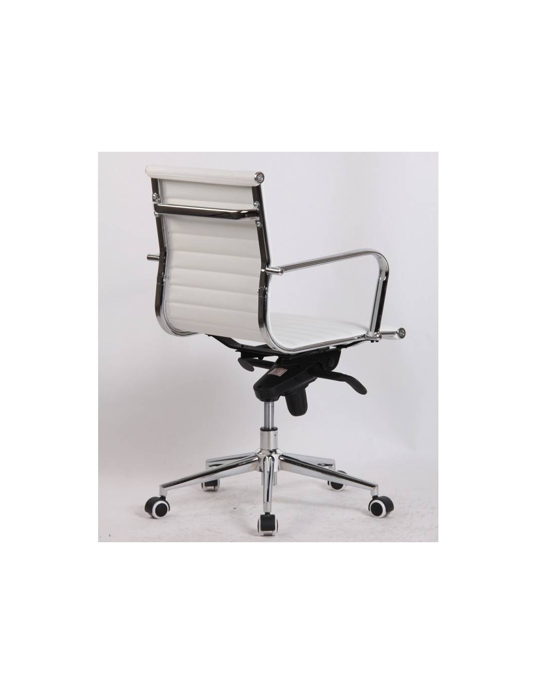 Poltrona de escritório de design moderno com encosto médio. Estofado em couro sintético preto ou branco com costura horizontal. Costas com as mesmas costuras Elevação por pistão a gás, com acabamento cromado. Mecanismo multifuncional com inclinação avançada, fixação em qualquer ângulo, ajuste de intensidade e botão de ajuste de altura. Armação e braços cromados. Base de design em aço cromado, muito resistente.
