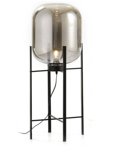 Abajur de pé de estilo industrial. Estrutura metálica pintada em epoxy preto, onde apoia a a ou recipiente em forma de silo de vidro cinza. Preparada para lâmpada E27 não incluída. Lâmpada de design ideal para qualquer ambiente ou como toque diferencial em decorações minimalistas.