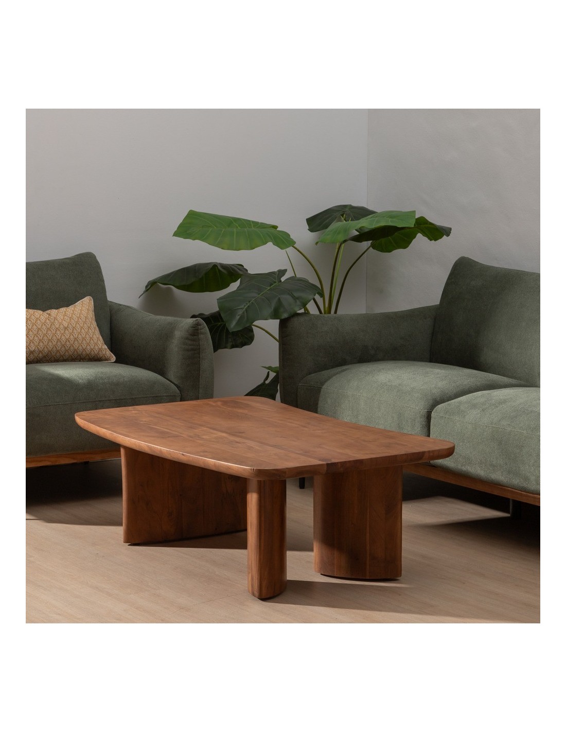 Mesa de centro OAQ em madeira de mangueira com acabamento castanho, 130 x 70 cm.