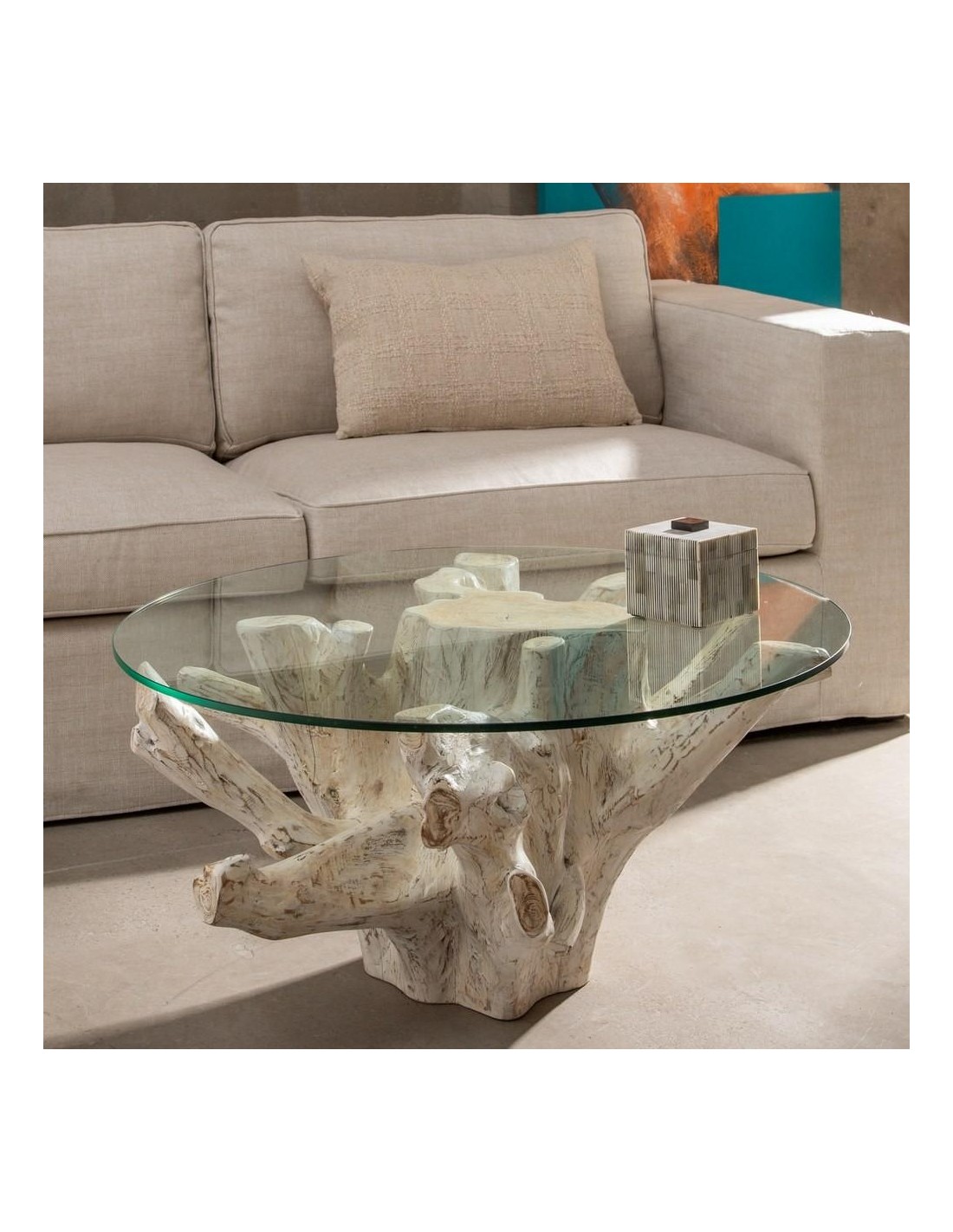 MESA DE CENTRO en vidro RAIZ 90 x 45, madeira teca em BRANCO ESCOVADO
