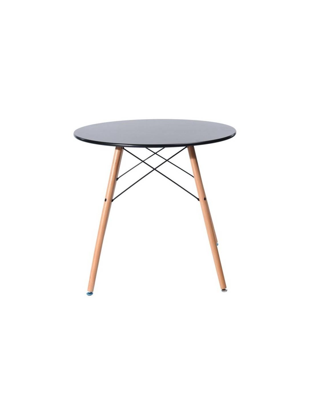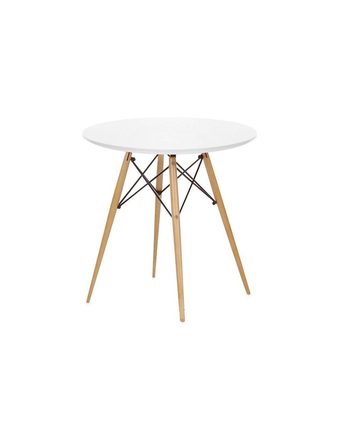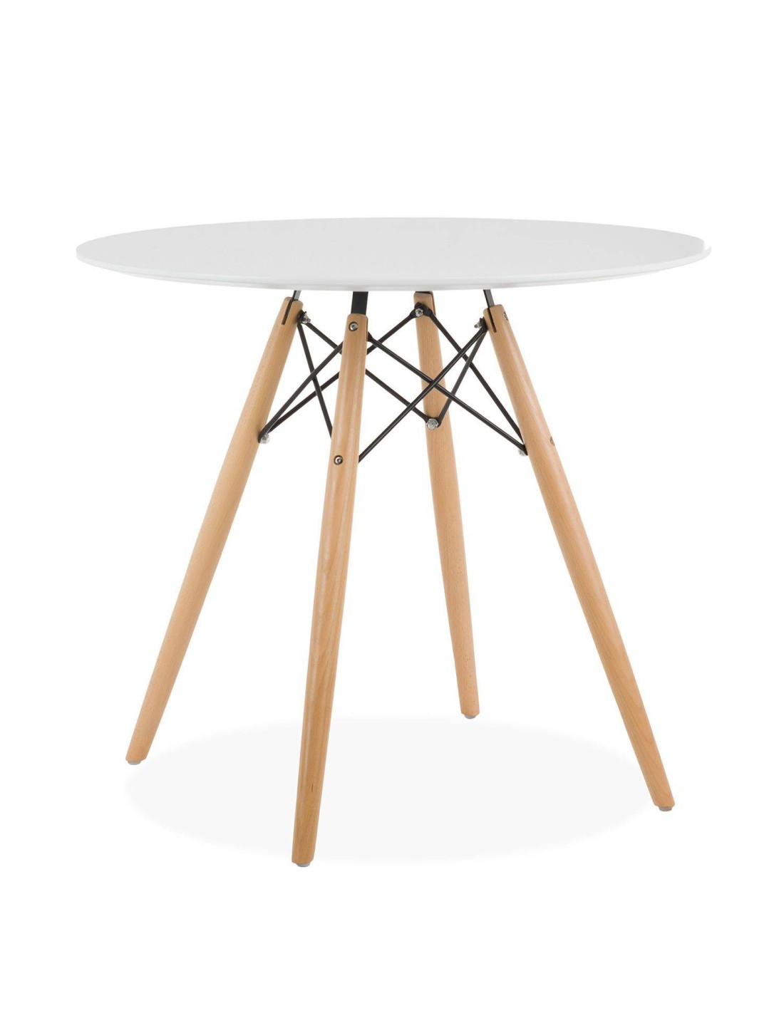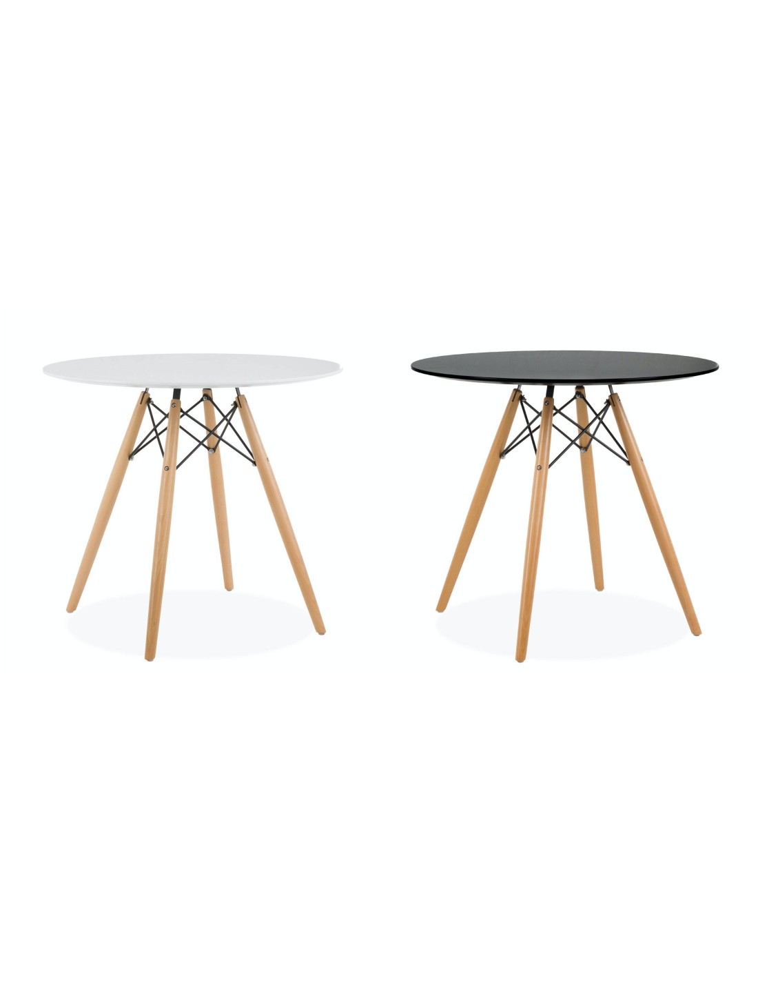 Mesa redonda de jantar ou cozinha de design moderno. Estrutura de madeira de faia com hastes de ligação de metal acabadas em preto. Tampa de madeira lacada em branco de 80 cm de diâmetro. Elegante e funcional, em todo um ícone do design.