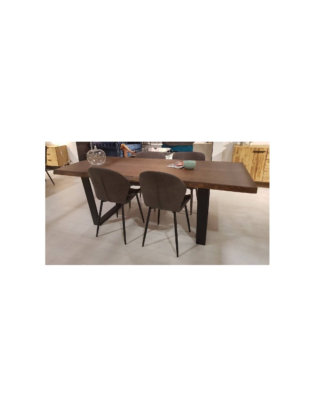 Mesa em madeira de Freixo maciça terminado na cor Havana. Pés de metal pintados em preto. O design desta mesa foi concebido para respeitar ao máximo a naturalidade da madeira. Por isso cada peça é única, porque cada um pode apreciar o marmoreio próprio da madeira com que foi feito. Uma peça com caráter para uma casa com personalidade.