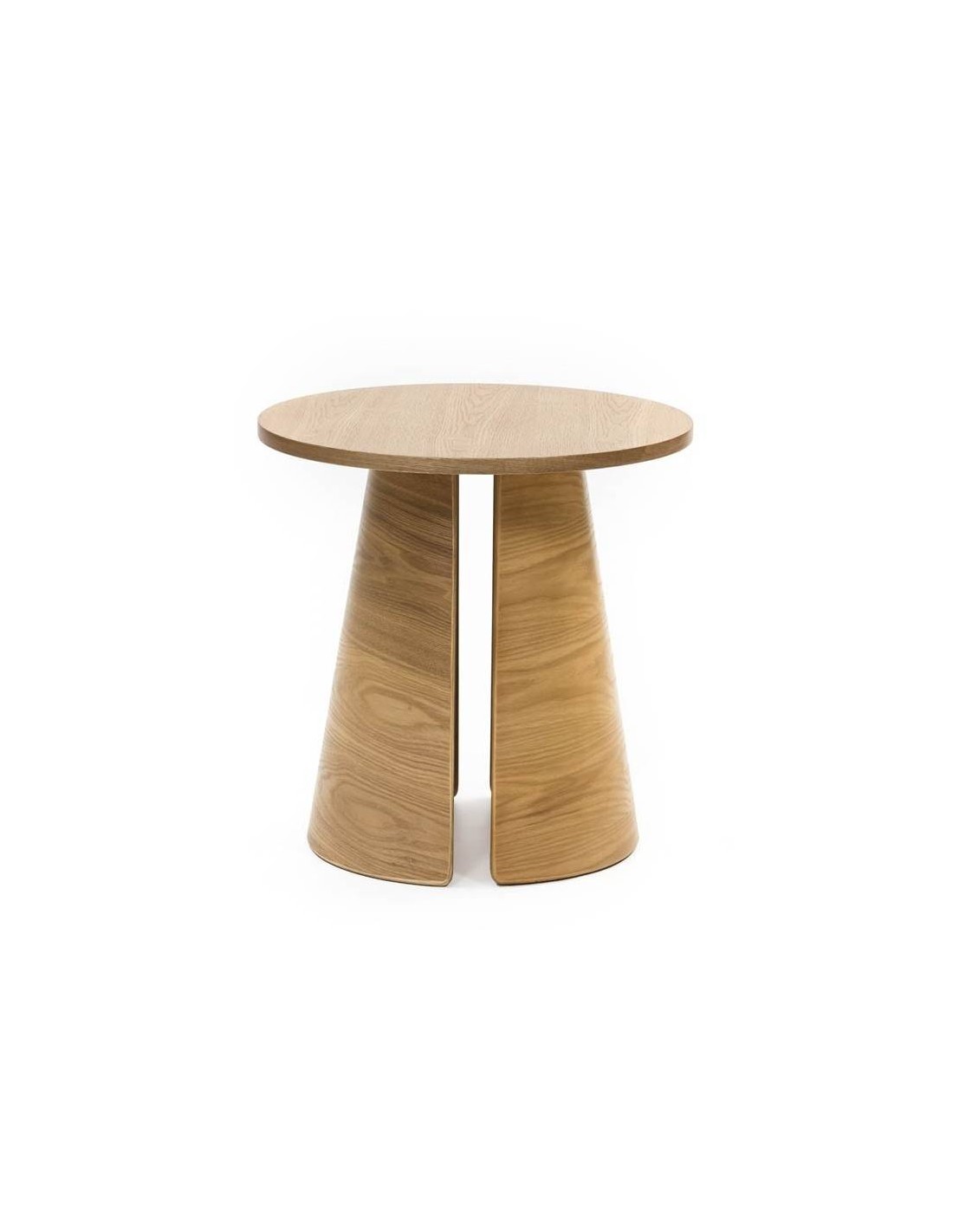 Simples e minimalista. A mesa redonda de canto Cep tem um tampo redondo que assenta sobre uma base composta por duas peças de madeira curvada. Tanto a parte superior como as pernas são feitas de MDF de contraplacado de freixo natural.