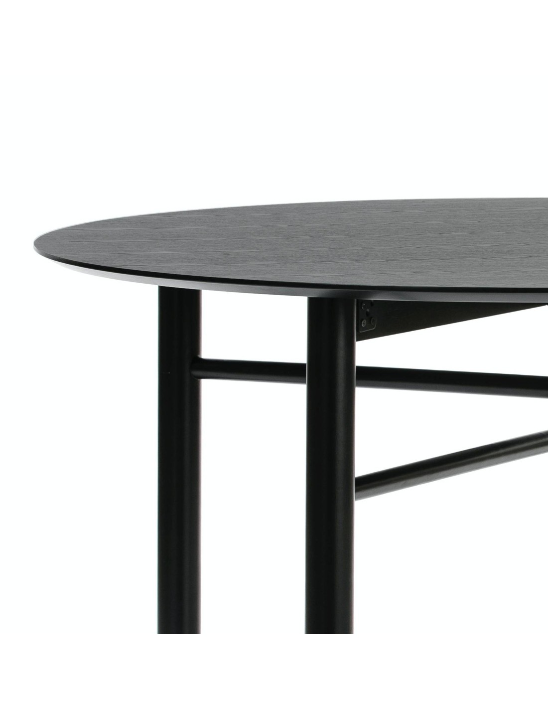 A mesa redonda Junco tem 4 patas unidas de dois em dois, através transversais cilíndricas de madeira. As transversais se cruzam sem chegar a cortar entre elas. O envelope apresenta um leve espaço que facilita visualmente.MDF banhado em fresno pintados em preto e as patas são de madeira maciça, com um arredondamento na parte inferior. Se tem procurado criar uma silhueta esguia, mínima e elegante.