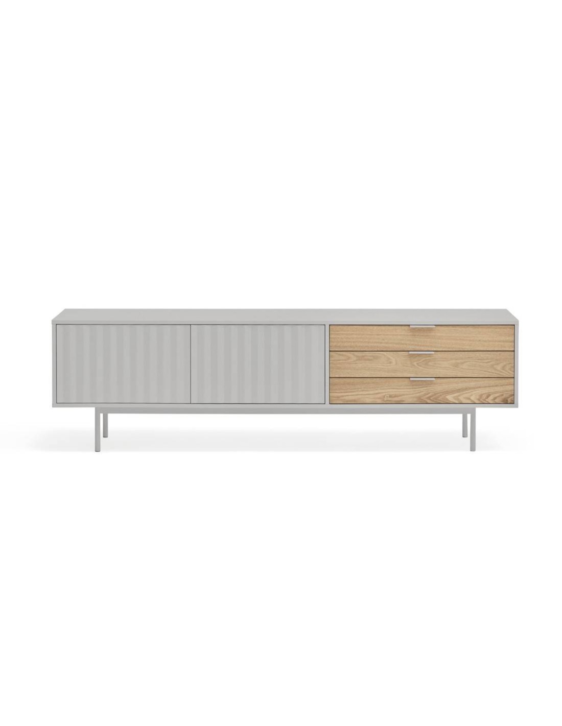 Projetado por Cambres Design para a marca TEULAT. Mesa de TV com design moderno. Uma das características desta mesa de TV é que, apresenta sobre suas frontais um relevo serrilhado particular da coleção. É feito em DM lacado em cinza, e incorpora abertura e fechamento de portas com push. Dispõe de uma perna de apoio regulável para um ajuste à perfeição ante qualquer desnível do solo. Dispõe de duas portas com a trama singular desta série e duas gavetas em folheado de carvalho natural. Seu interior dispõe de duas prateleiras, configurando várias possibilidades de armazenamento e organização.