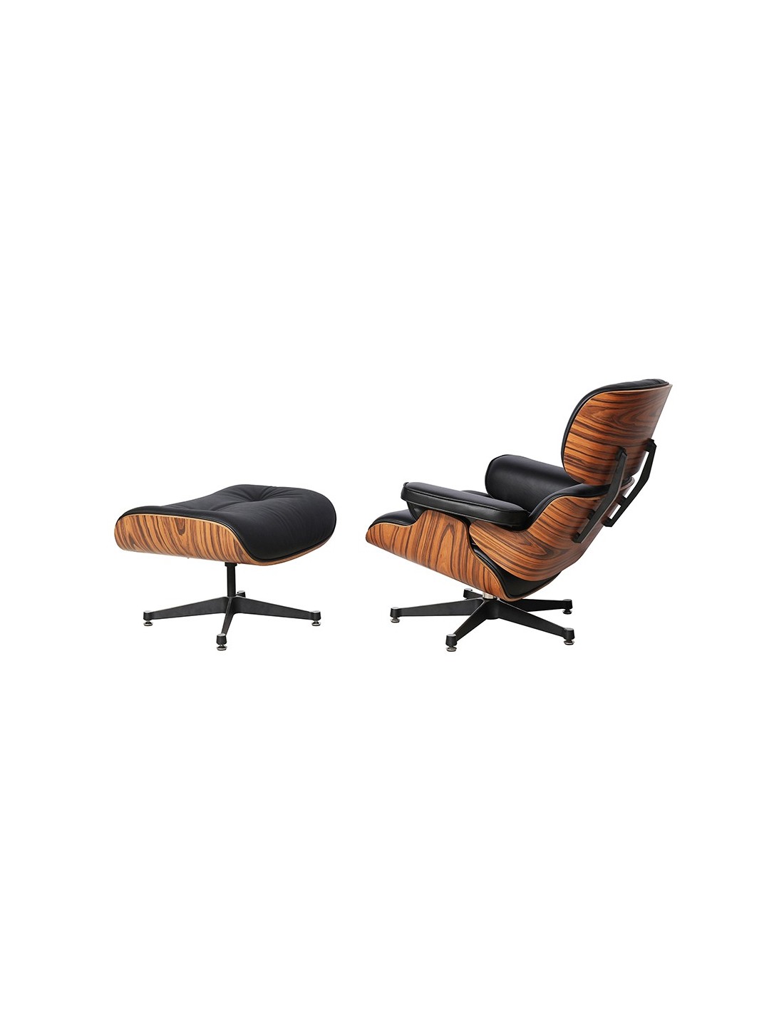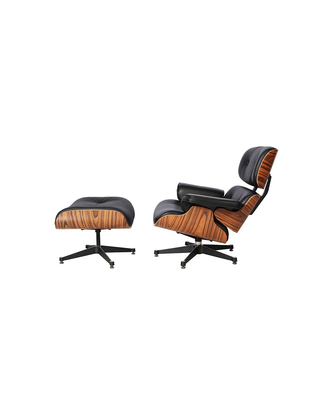 Poltrona com pufe, couro preto, jacarandá e pernas de alumínio preto