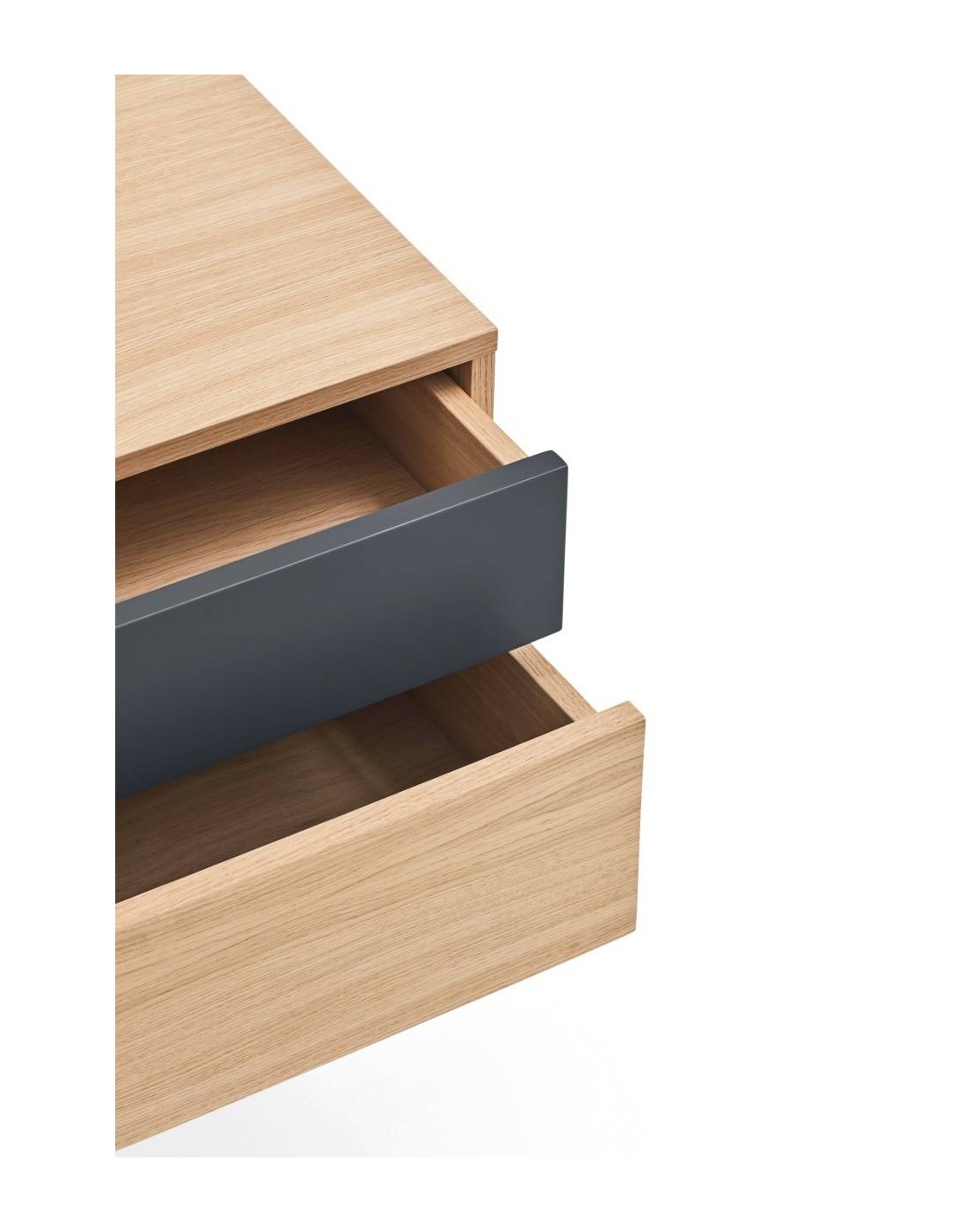 Mesa auxiliar de design minimalista moderno feito em folheado de carvalho natural de cor clara e combinado com lacado em cor cinza antracite, em uma base com pés metálicos retranqueados lacados no mesmo tom. Dispõe de 2 gavetas um lacado em cinza antracite e outro acabado em carvalho. A Yoko combina a naturalidade da madeira com detalhes em cores, tornando-a perfeita para se encaixar em diferentes ambientes.