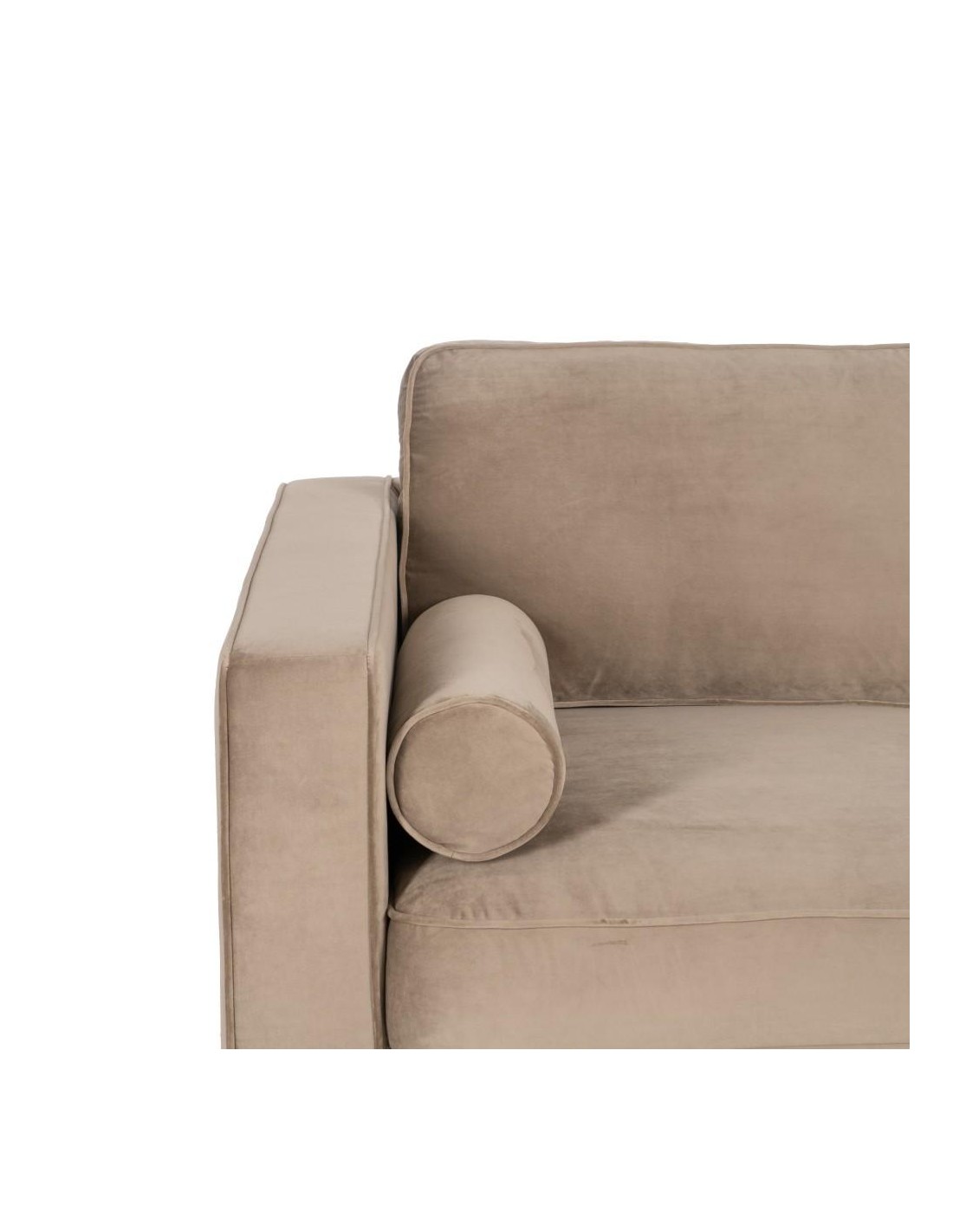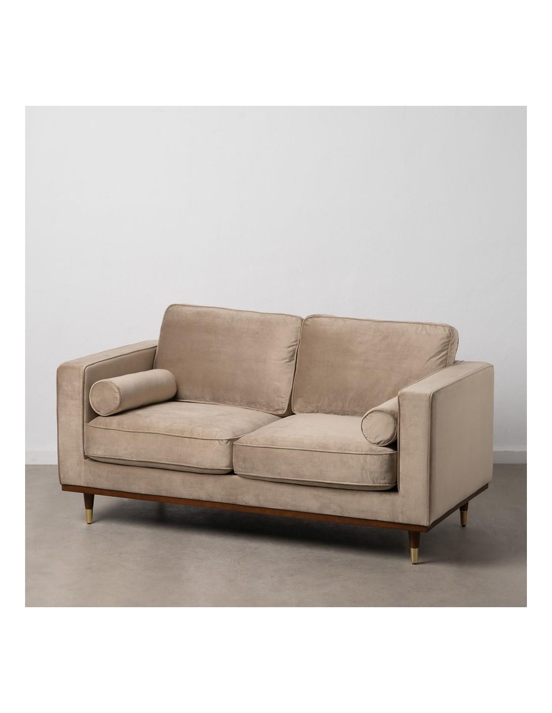SOFÁ 2 PLAZAS TERCIOPELO CHAMPÁN 172 X 89 X 91 CM Material: 100% poliéster, terciopelo. Estructura: madera conglomerada - madera de caucho Gramaje: 260g/m2. Patas: Relleno: foam, densidad asiento y respaldo: 28-30Kg./m3 Densidad parte trasera: 25Kg./m3. Cojines, asientos y respaldo: desenfundables con cremallera. Máximo peso autorizado: 200Kgr. Altura asiento: 50cm. Altura pata: 19.5cm. Ancho asiento: 140cm. Profundidad asiento:56cm. Altura respaldo: 44cm. Ancho asiento con cojines: 123cm. Altura reposabrazos (desde el suelo): 71cm. Ancho reposabrazos (desde asiento): 27cm. Patas para montar. Las posibles sombras o marcas en el tejido son debidas al embalaje de las piezas. Desapareciendo fácilmente con la aplicación de vapor.